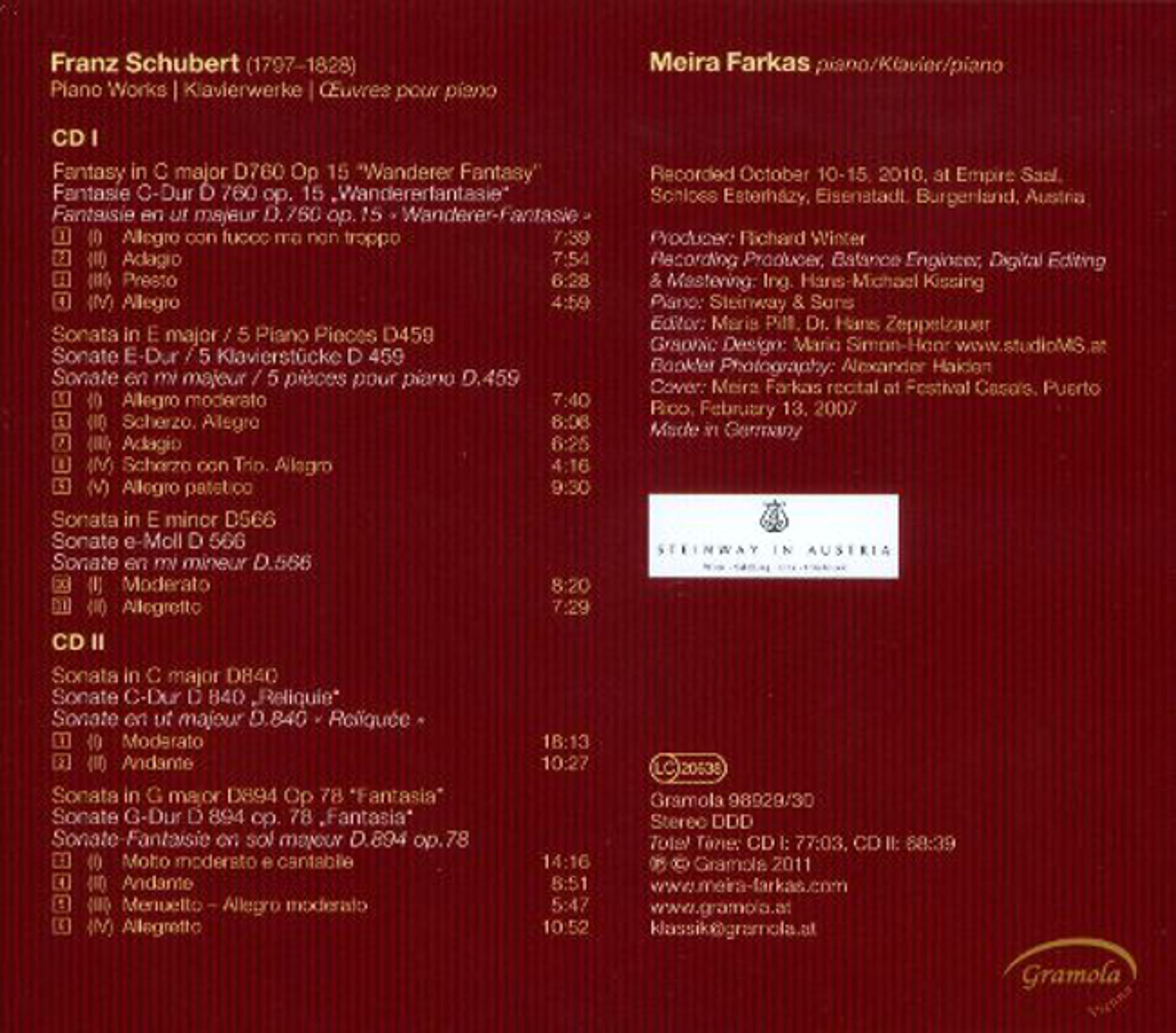 Die große Schubert-Pianistin Meira Farkas, Schülerin von Rosina Lhévinne, Wilhelm Kempff und dem Schnabel-Meisterschüler Leonard Shure, sowie Lehrerin u. a. von Till Fellner und Kammermusikpartnerin von Pablo Casals, Sándor Vegh und Rudolf Serkin, hat bisher bei Gramola Schuberts drei letzte Sonaten D 958 bis 960 und die »Drei Klavierstücke D 946« veröffentlicht, die z. B. von Karl Löbl unter dem Titel »Dem Himmel so nah« hymnisch rezensiert worden sind: »Tief empfundene, souverän gestaltete Interpretationen, an denen man sich nicht satt hören kann« (Gramola 98786 / 87). Nun hat sie ein weiteres Doppelalbum mit einem reichhaltigen Überblick über die Klavierwerke Schuberts aufgenommen: die »Wandererfantasie« und die Klaviersonaten E-Dur D 459, e-Moll D 566, C-Dur D 840 und die »Sonata Fantasia« G-Dur D 894.
