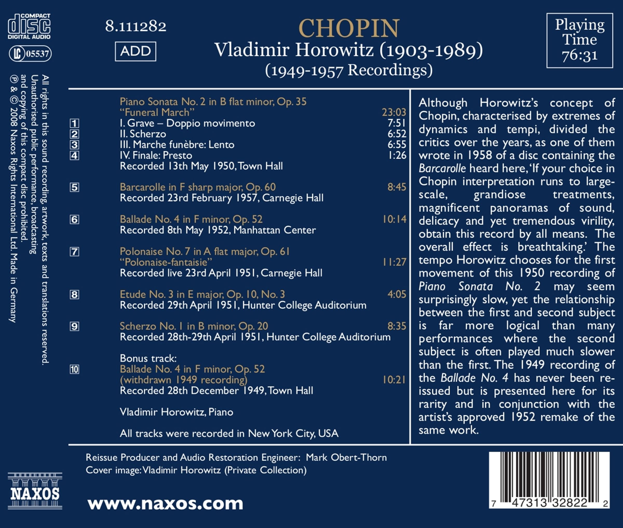 Although Horowitz's concept of Chopin, characterised by extremes of dynamics and tempi, divided the critics over the years, as one of them wrote in 1958 of a disc containing the Barcarolle heard here,'If your choice in Chopin interpretation runs to largescale, grandiose treatments, magnificent panoramas of sound, delicacy and yet tremendous virility, obtain this record by all means. The overall effect is breathtaking.' The tempo Horowitz chooses for the first movement of this 1950 recording of Piano Sonata No. 2 may seem surprisingly slow, yet the relationship between the first and second subject is far more logical than many performances where the second subject is often played much slower than the first. The 1949 recording of the Ballade No. 4 has never been reissued but is presented here for its rarity and in conjunction with the artist's approved 1952 remake of the same work.