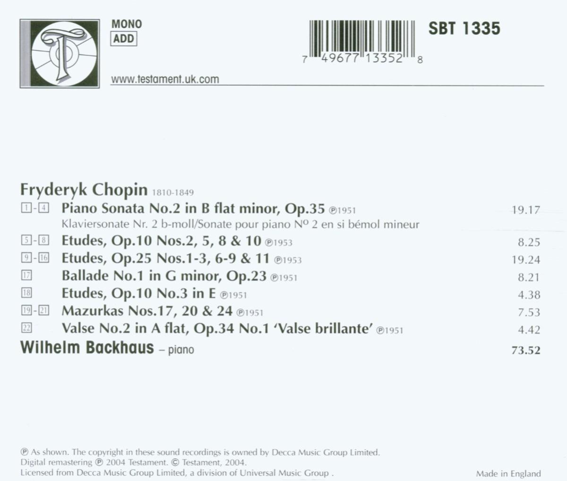Wer Wilhelm Backhaus (1884-1969) als kongenialen Interpreten von Bach, Beethoven und Brahms kennt und schätzt, der dürfte sich vielleicht über die Chopinplatte bei Testament etwas wundern, doch spielte Chopin für Backhaus in seinen frühen Jahren eine zentrale Rolle. Immerhin war 1928 Backhaus der erste, der Chopins Etüden komplett auf Tonträger bannte.