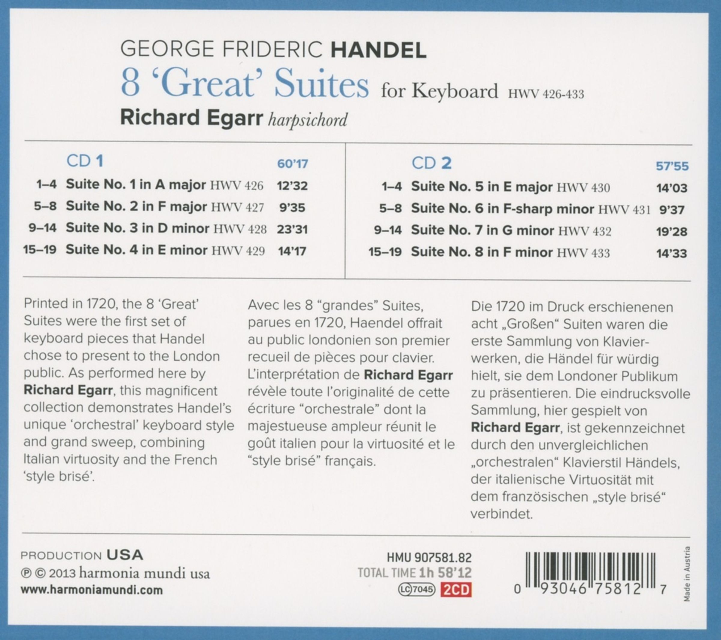 Die 1720 im Druck erschienenen acht »großen« Suiten waren die erste Sammlung von Klavierwerken, die Händel für würdig hielt, sie dem Londoner Publikum zu präsentieren. Die eindrucksvolle Sammlung, hier gespielt von Richard Egarr, ist gekennzeichnet durch den unvergleichlichen »orchestralen« Klavierstil Händels, der italienische Virtuosität mit dem französischen »style brisé« verbindet.