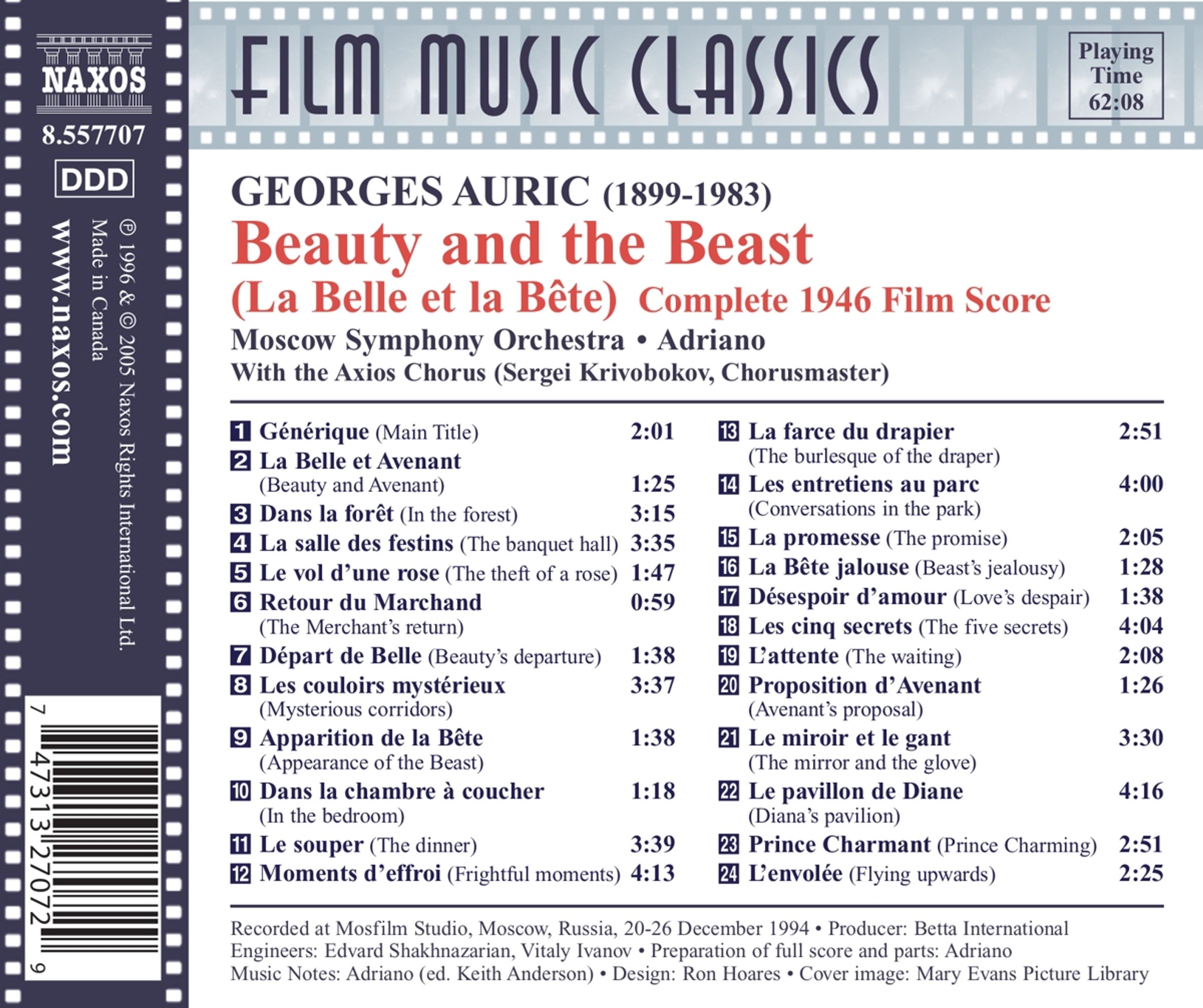 M.Keller in FonoForum 10/96: "Erstmals die vollständig rekonstruierte und erst 1992 wieder- entdeckte Partitur zu Jean Cocteaus "La Belle et la bete" aus dem Jahre 1946 zu Gehör. Das vom Moskauer Sinfonieorchester äußerst engagiert dargebotene Werk Georges Aurics (der über 90 Film- musiken schrieb) mag vor allem diejenigen aufhorchen lassen, die das Komponieren für den Film gern als mediokres Genre abtun."Disk 1 von 1 (CD)