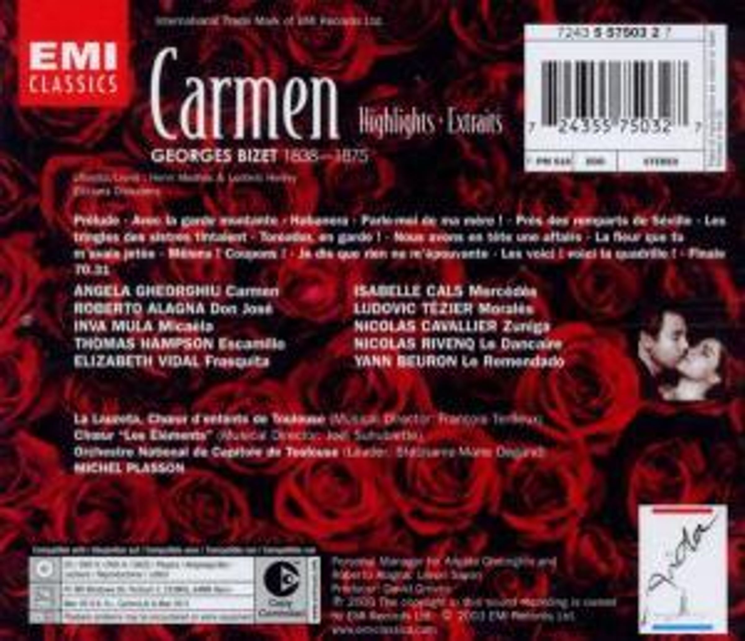 Die Oper Carmen zählt heute zu den populärsten Opern überhaupt und ist laut Statistik die meistgespielte Oper weltweit. Bizet schrieb das Werk ganz im Stil der Opéra comique, d. h. mit gesprochenen Dialogen zwischen den Musiknummern und mit Melodramen. Diese neue Produktion präsentiert mit Angela Gheorghiu (Carmen), Roberto Alagna (Don José) und Thomas Hampson (Escamillo) die großen Stars der Opernwelt. Das Orchestre National du Capitole de Toulouse wird von Michel Plasson geleitet. Als besonderes Highlight enthält diese Aufnahme eine Arie von Bizet, die lange Zeit als verschollen galt und hiermit ihre Welturaufführung wie auch CD-Premiere erlebt.