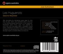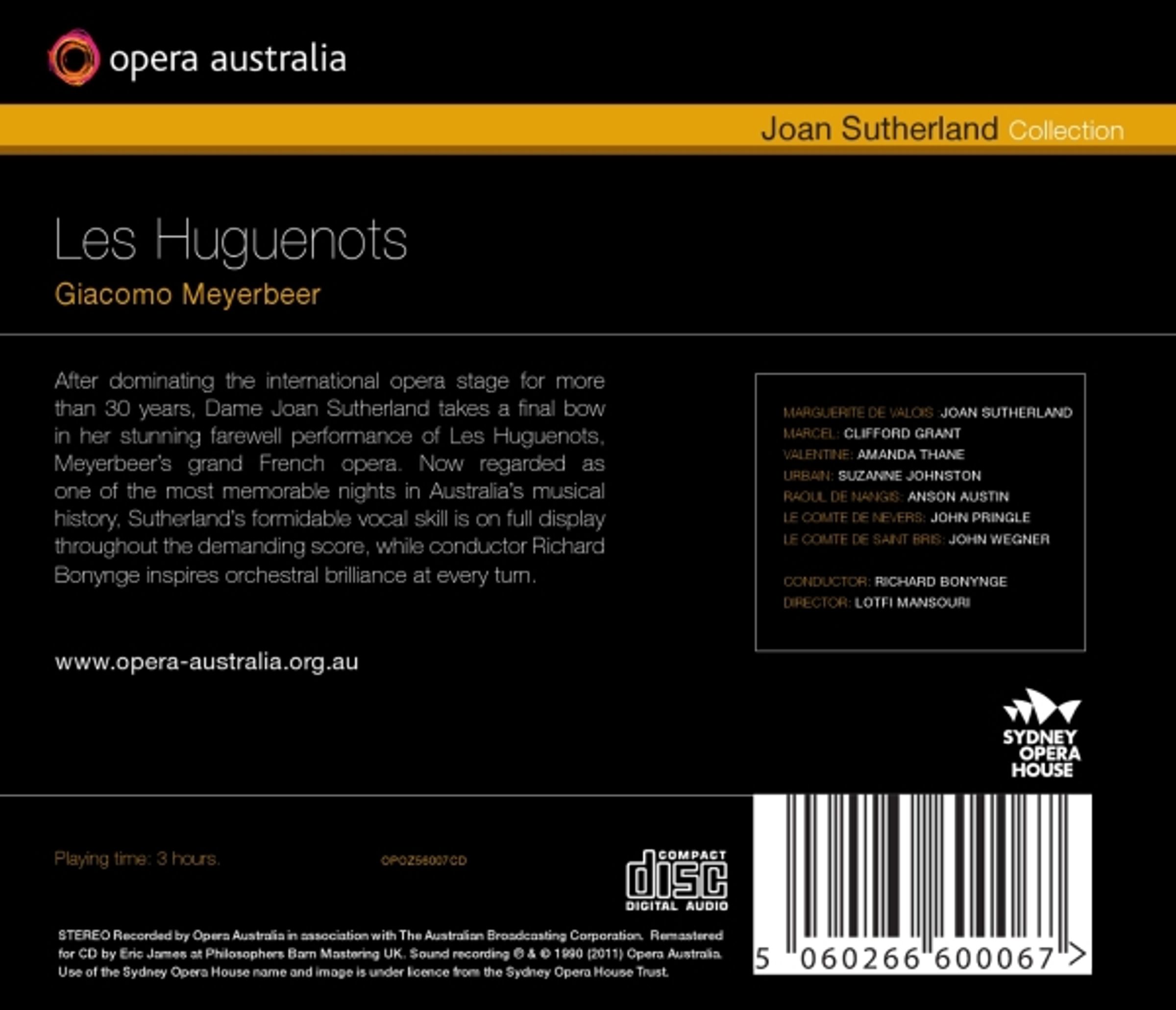 Mit Giacomo Meyerbeers großer französischer Oper „Les Huguenots“ beendet Joan Sutherland nach über 30 Jahren ihre internationale Opernkarriere. Sutherlands herausragende Stimme sowie die brillante Interpretation des Werkes durch den Dirigenten Richard Bonynge machen den Abend der Aufführung zu einem der bedeutendsten der australischen Musikgeschichte. Dieser einmalige Moment wurde in der vorliegenden CD festgehalten und lässt den Zuhörer an dem denkwürdigen Auftritt teilhaben.