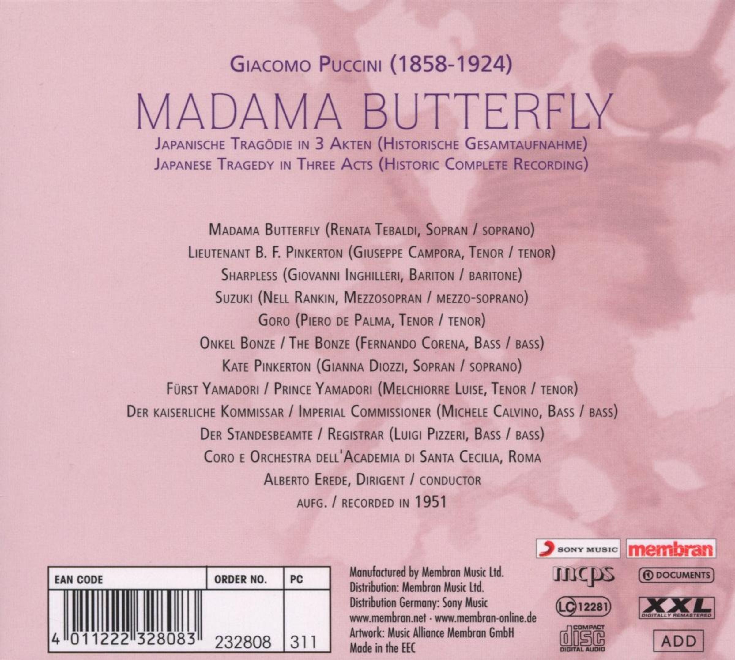 Giacomo Puccinis Opere Madama Butterfly, mit Renata Tebaldi und Giuseppe Campora in den Hauptpartien. Dirigat Alberto Erede. Aufnahme von 1951, digital remastered.