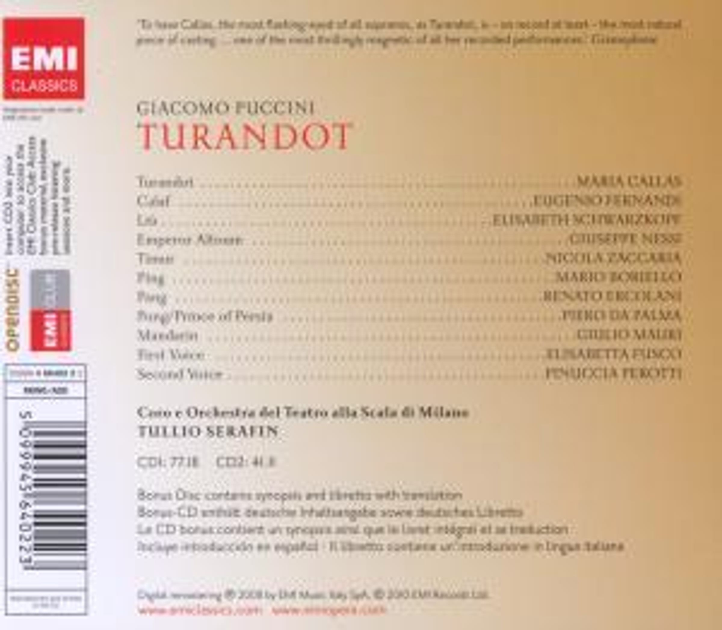 FonoForum 01/10: "Um nur einen der vielen magischen Momente zu nennen: In ihrer großen Arie "In questa reggia" illuminiert Maria Callas mit einer einzigen Silbe ihren gesamten Bühnencharakter, wenn sie den Namen ihrer Ahnfrau Lou-Ling mit all dem Grauen auflädt, das dieser widerfahren ist und dessentwegen sie sich selbst mit emotionalem Eis umgürtet. Einen solchen Erkenntnisblitz löst die mit einer Trompete in der Kehle gesegnete Birgit Nilsson in der gesamten Oper kein einziges Mal aus."Disk 1 von 2 (CD)