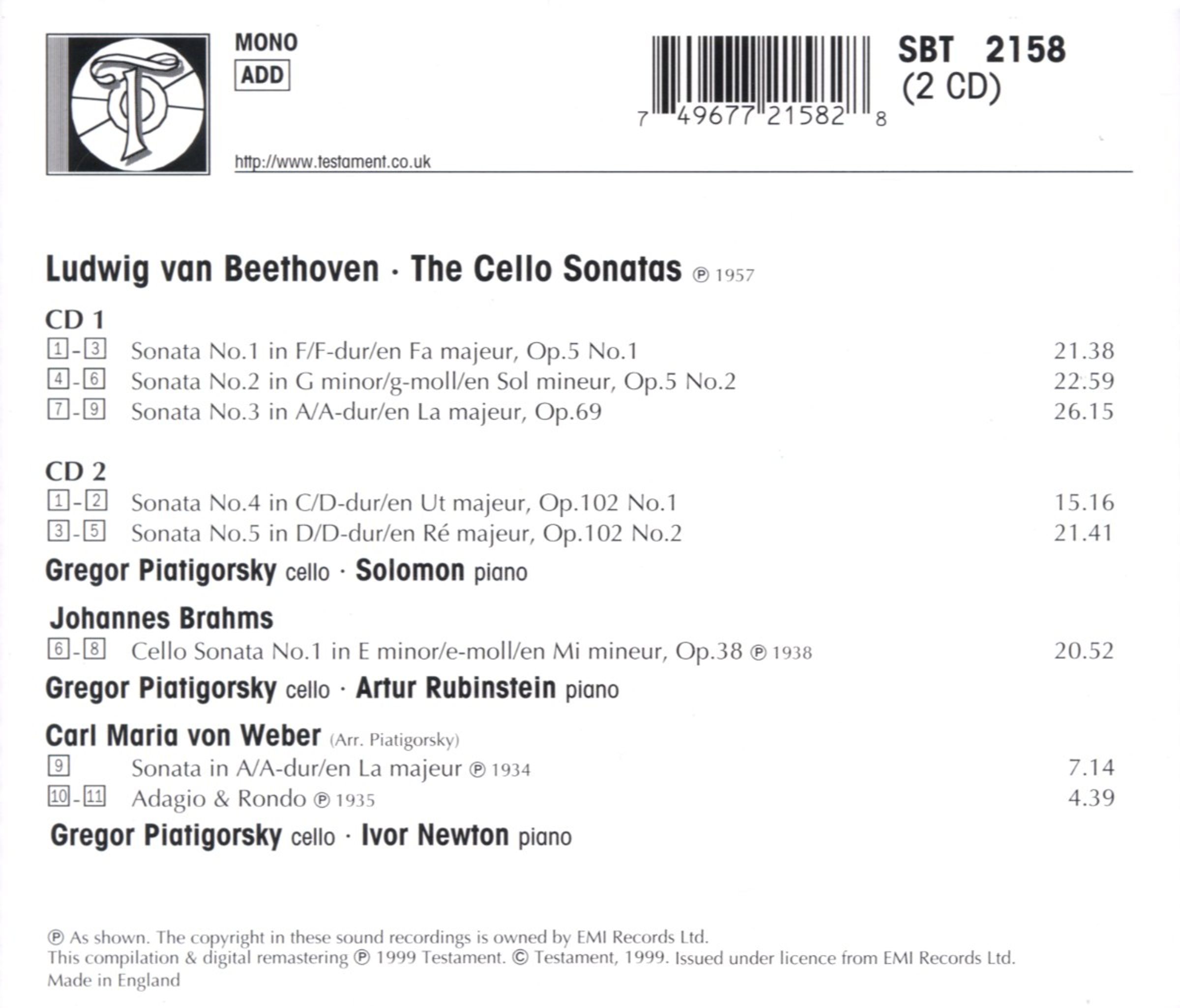 - Gregor Piatigorsky (Cello),Ivor Newton, Arthur Rubinstein & Solomon (Klavier)