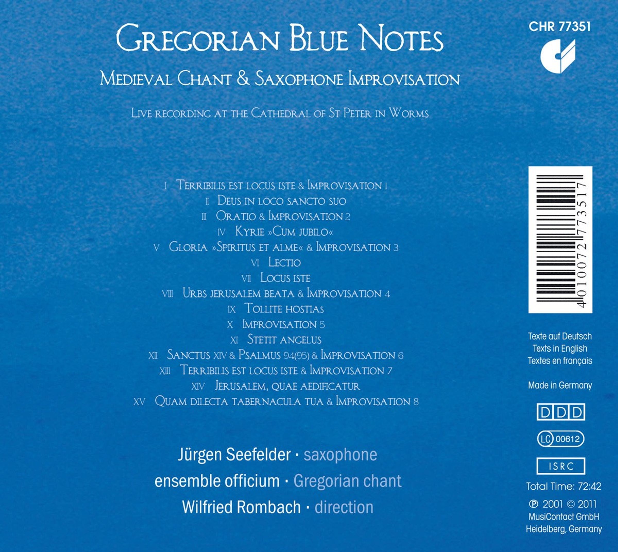 Gregorianische Gesänge zur Liturgie des Kirchweihfestes mit den Mess-Ordinarien, Psalmen und Hymnen mit Saxophon-Improvisationen. (Live-Mitschnitt aus der St. Peter Kathedrale Worms)