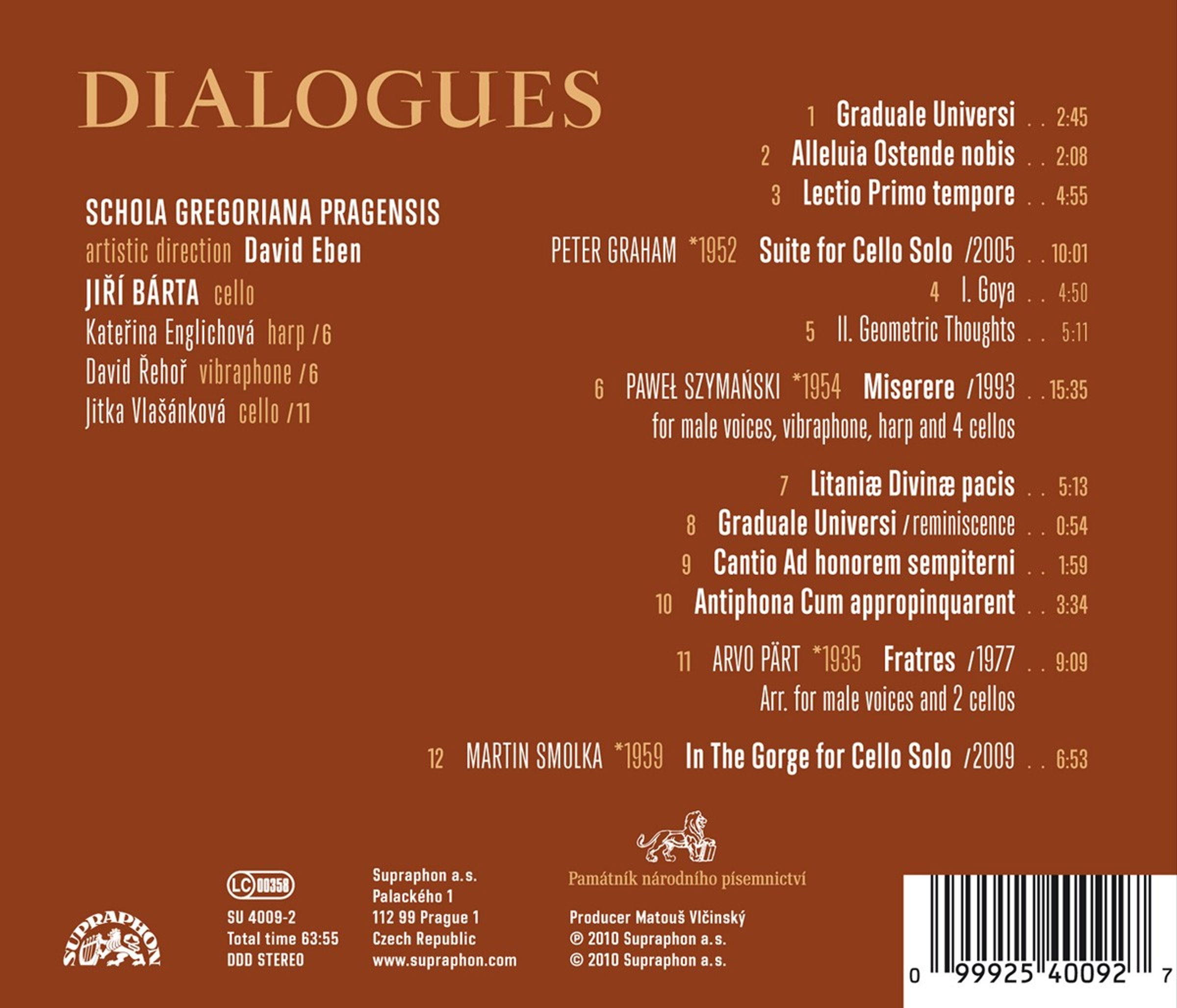 The renowned ensemble Schola Gregoriana Pragensis and the leading Czech cellist Jiri Barta have been pursuing dialogues on concert stages for a number of years. They share abundant experience of music both early and contemporary, improvisation and seeking. The fruit of their encounters is a recording that is a multilayered dialogue between the sonorous sound of the cello and the male voice, a dialogue between the chorale and medieval polyphony and the creation of the past few decades, music written and improvised. The idea of "mirroring the past in the present" is the overarching theme connecting pieces by contemporary composers. Peter Graham's Suite for Cello Solo reveals his having been inspired by Bach solo suites. The contemporary musical phraseology and the Gregorian tradition are originally interconnected in the meditative composition Miserere by the Polish creator Paweł Szymański, while the structure of Arvo Pärt's famous piece Fratres is a sort of reminiscence of medieval polyphony. The music, in places verging on silence, affords the listener scope for inner soothing and perception of fine nuances that often remain concealed to us in the turbulent world around.