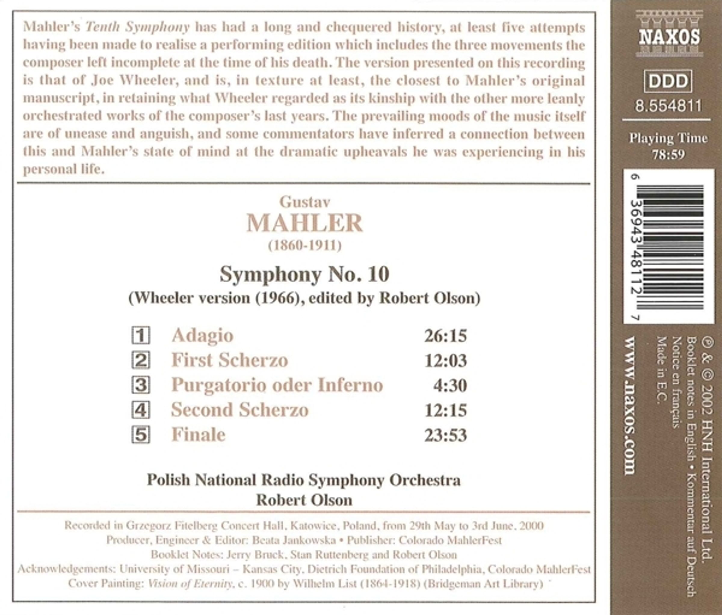 Was ist mit Wheelers Partitur? Bis heute ist von dieser, einer der ältesten Versionen der Zehnten Symphonie, noch nie eine zufriedenstellende Aufführung gegeben oder aufgezeichnet worden. Wheeler begann 1952 mit der Arbeit an seiner Partitur, und es ist seine vierte und letzte Überarbeitung, die wir auf dieser Aufnahme hören. Wheelers ist, zumindest von der Textur her, dem Originalmanuskript Mahlers am nächsten, ganz im Sinne dessen, was er als Verwandtschaft zu den anderen, schlanker instrumentierten Werken, die Mahler in Toblach komponierte, ansah.
