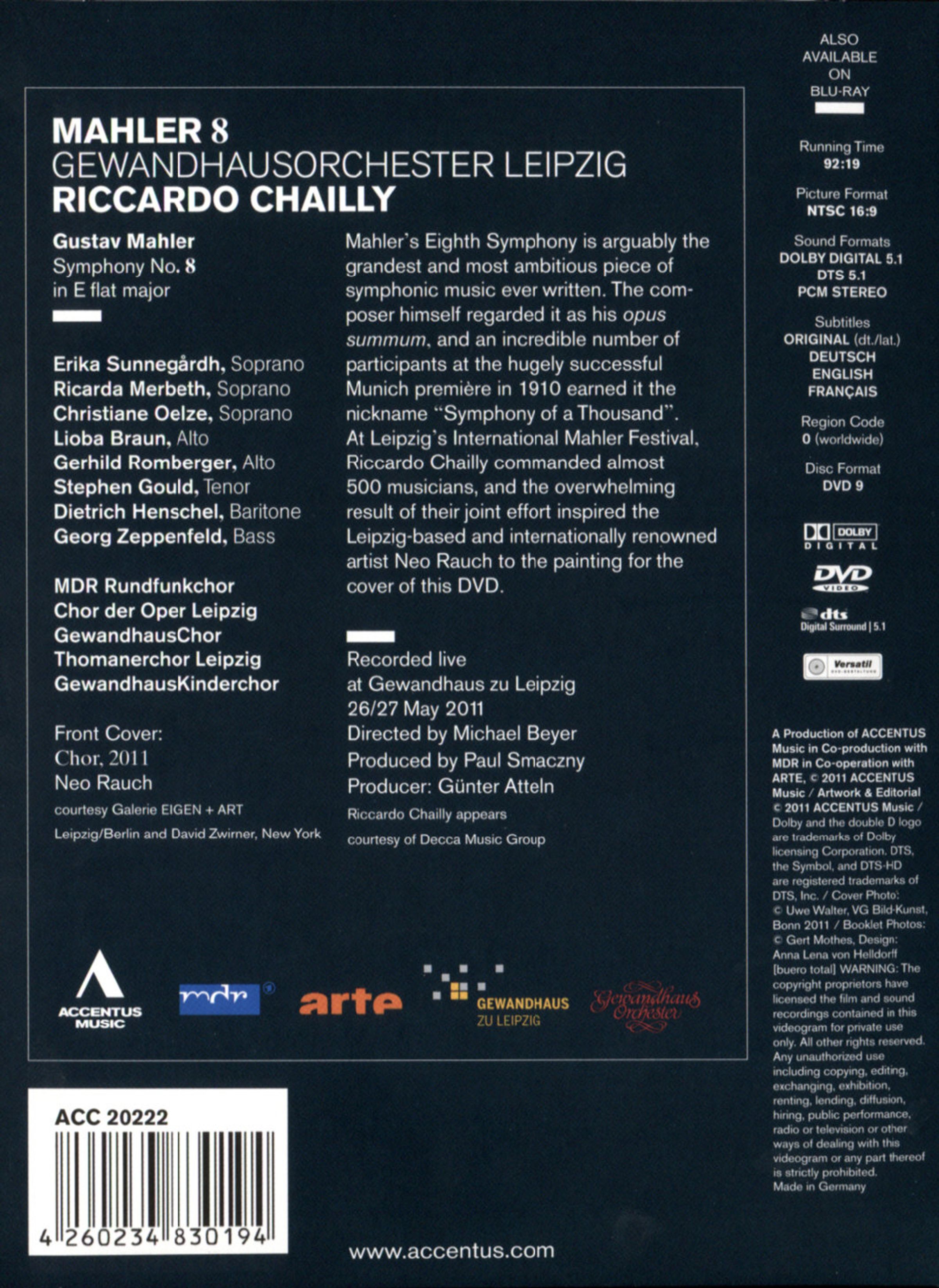 Mit der 8. Sinfonie und den rund 500 Mitwirkenden brachte Gewandhauskapellmeister Riccardo Chailly außerdem Mahlers „Opus magnum“ auf die Bühne, wie der Komponist sein Werk selbst bezeichnete. Die jetzt als DVD und Blu-ray erscheinende Aufnahme zählt zu den wenigen überhaupt existierenden Aufzeichnungen dieser herausragenden Sinfonie.