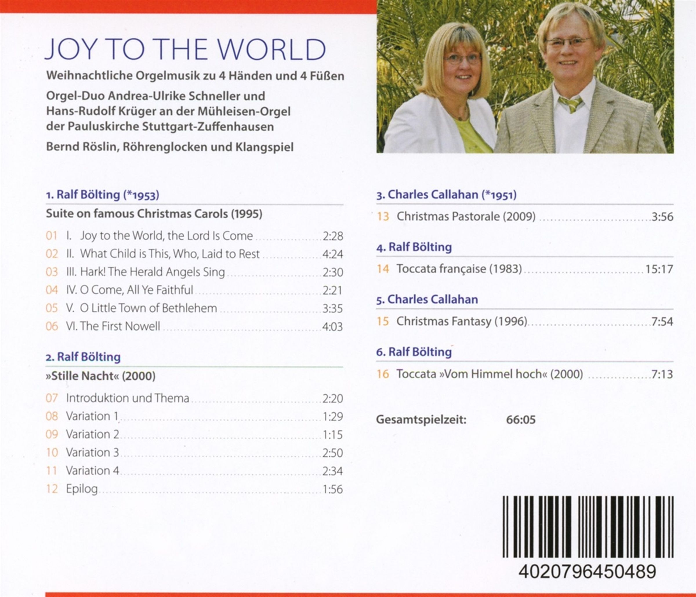 Die CD "Joy to the world" beinhaltet weihnachtliche Orgelmusik zu 4 Händen und 4 Füßen, interpretiert durch das Orgel-Duo Andrea-Ulrike Schneller und Hans-Rudolf Krüger. Die beiden international anerkannten Konzertorganisten legen hiermit eine CD vor, die weitab vom "Mainstream" bekannte Weihnachtslieder aus dem deutschen und anglogermanischen Kulturraum in interessanten zeitgenössischen Kompositionen vorstellt. Das "begnadet aufspielende Orgel-Duo", so die Fachpresse, hat die Weihnachts-CD an einem vorbildlich klingenden Instrument, der Mühleisen-Orgel der Pauluskirche Stuttgart-Zuffenhausen eingespielt. Das 24-seitige Booklet (deutsch und englisch) gibt zahlreiche Hintergrund-Informationen zu den Werken, den Interpreten und Komponisten.