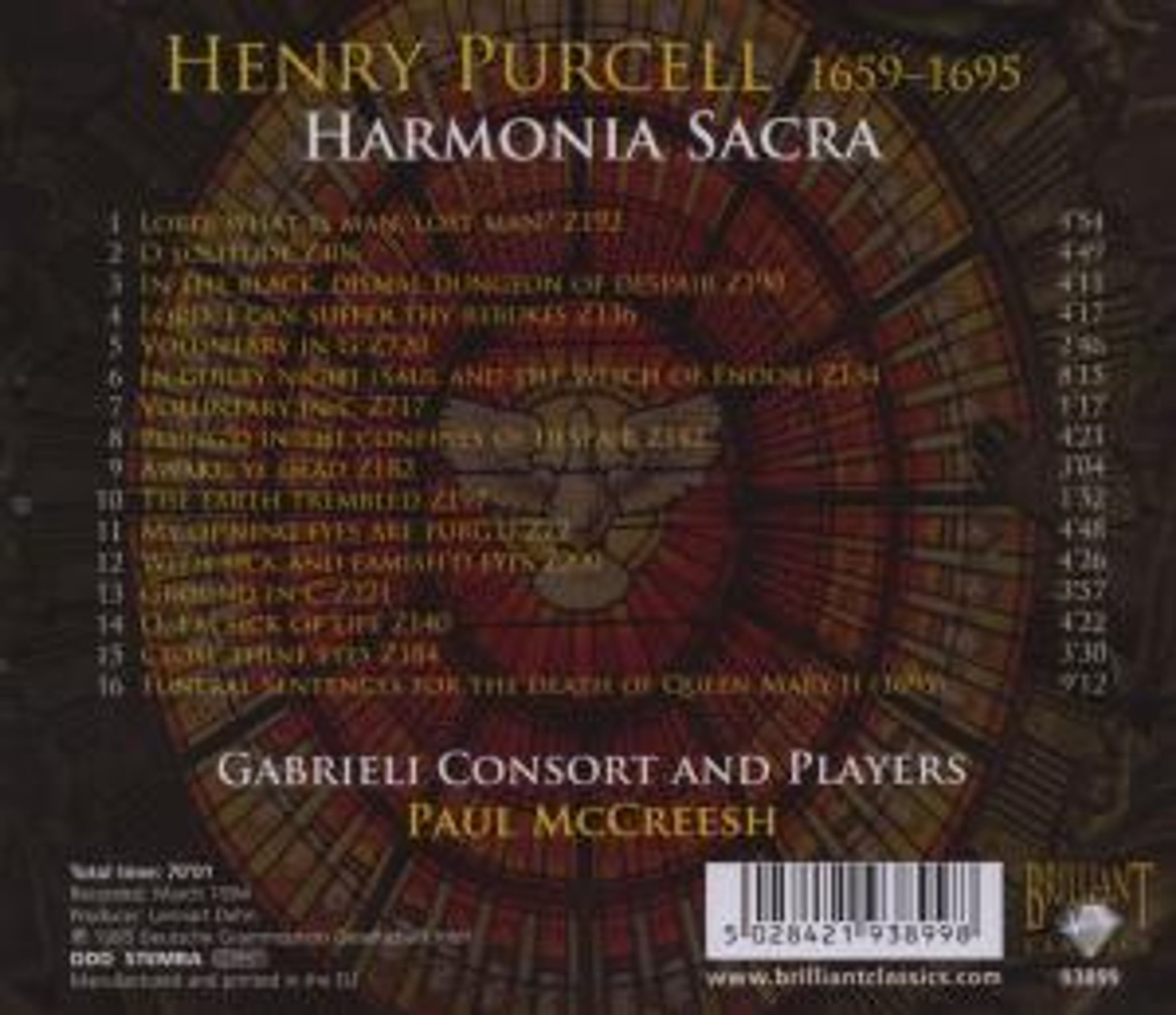 Diese Aufnahme verbindet die geistlichen Lieder mit Orgelwerken – Purcell war einer der brillantesten Organisten seiner Zeit, hinterließ aber überraschenderweise nur etwa sechs Werke für dieses Instrument. Weitere Informationen: Aufnahmejahr 1994; Auszeichnung als »Editor's Choice« des Gramophone-Magazins im Juli 1995; 2009 jährte sich Purcells Geburtstag zum 350. Mal, und seine Musik stand im Mittelpunkt zahlreicher Medien- und Live-Aufführungen – Paul McCreesh und das Gabrieli Consort gelten als herausragende Interpreten dieses Repertoires.