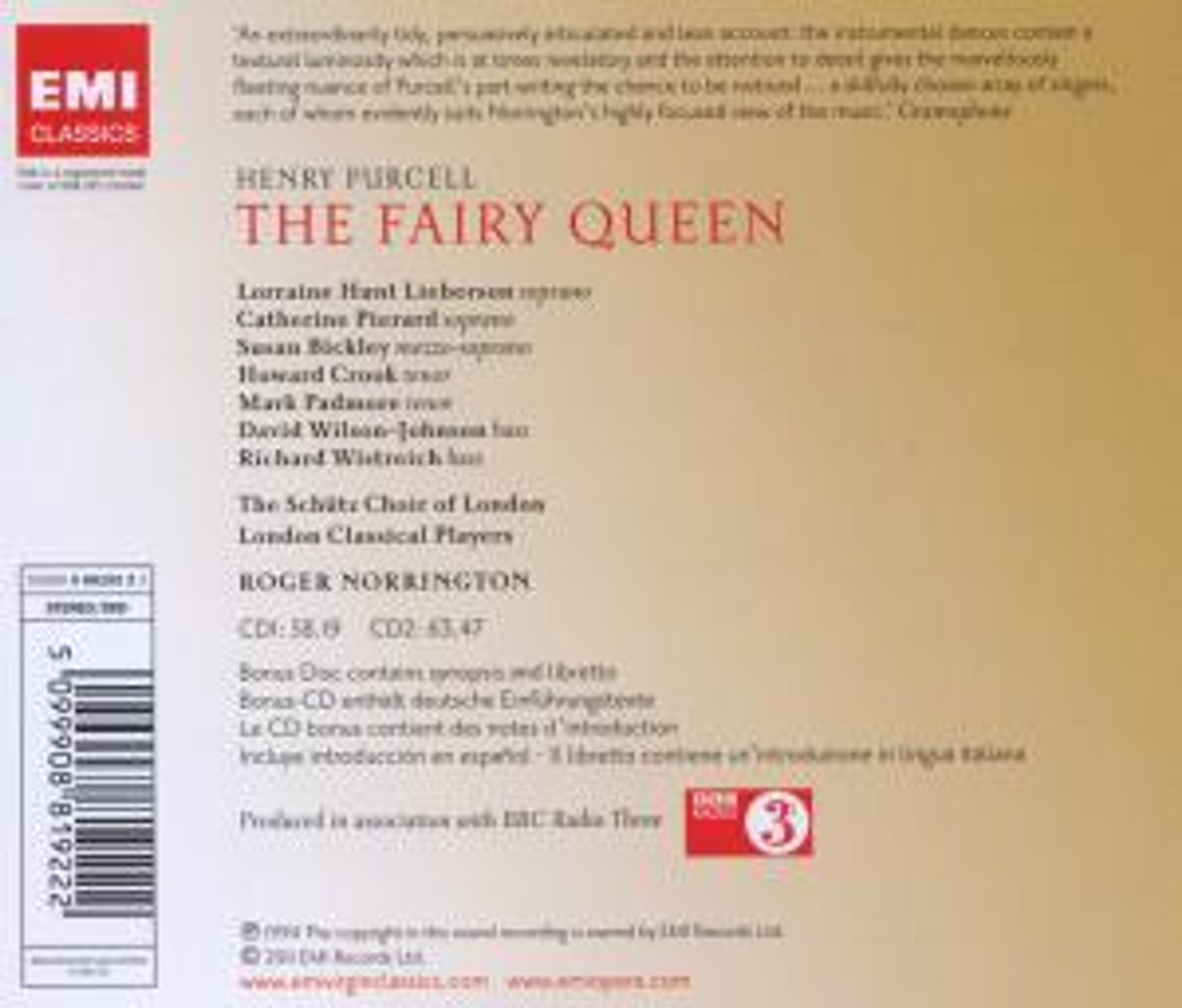 Mit »The Fairy Queen« - einer sehr freien Bearbeitung von Shakespeares »Sommernachtstraum« - schuf Purcell ein außergewöhnlich spektakuläres Werk. Die Produktion war eine der aufwendigsten, die jemals auf der englischen Bühne geboten wurde: Ausstattung und Kostüme (mit Feuerwerken und künstlichen Wasserspielen) verschlangen Unsummen. »The Fairy Queen« kann sowohl als Oper, als Bühnenmusik zu einem Schauspiel oder als ausgebautes Ballett angesehen werden. Gelegentlich wird dieses Werk heute auf Festivals für Alte Musik aufgeführt. Die Aufnahme unter der Leitung von Sir Roger Norrington stammt aus dem Jahre 1993 und wird jetzt auf Midprice wiederveröffentlicht.