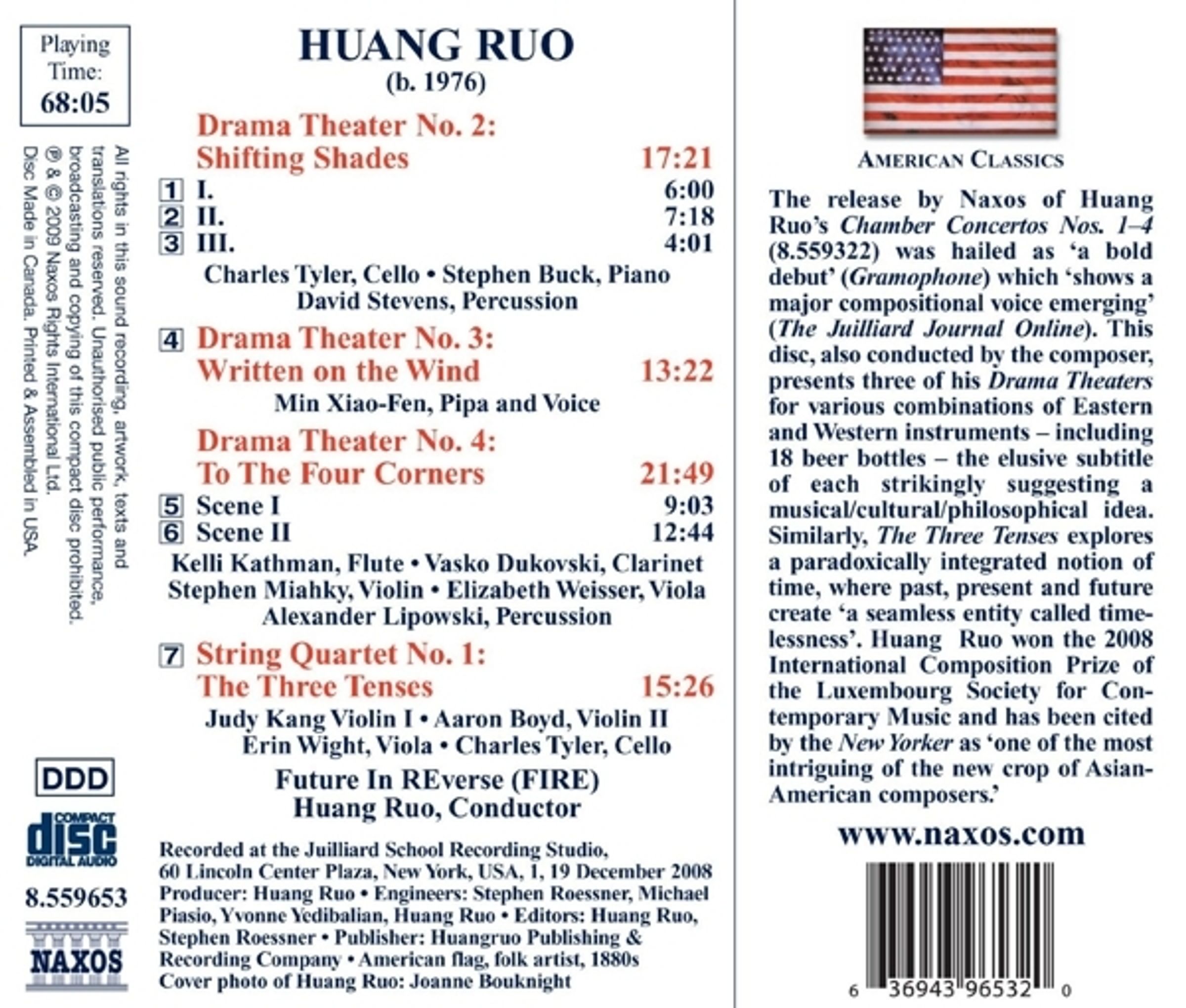 The release by Naxos of Huang Ruo's Chamber Concertos Nos. 1-4 (8.559322) was hailed as 'a bold debut' (Gramophone) which 'shows a major compositional voice emerging' (The Juilliard Journal Online). This disc, also conducted by the composer, presents three of his Drama Theaters for various combinations of Eastern and Western instruments-including 18 beer bottles-the elusive subtitle of each strikingly suggesting a musical / cultural / philosophical idea. Similarly, The Three Tenses explores a paradoxically integrated notion of time, where past, present and future create 'a seamless entity called timelessness'. Huang Ruo won the 2008 International Composition Prize of the Luxembourg Society for Contemporary Music and has been cited by the New Yorker as 'one of the most intriguing of the new crop of Asian-American composers.'