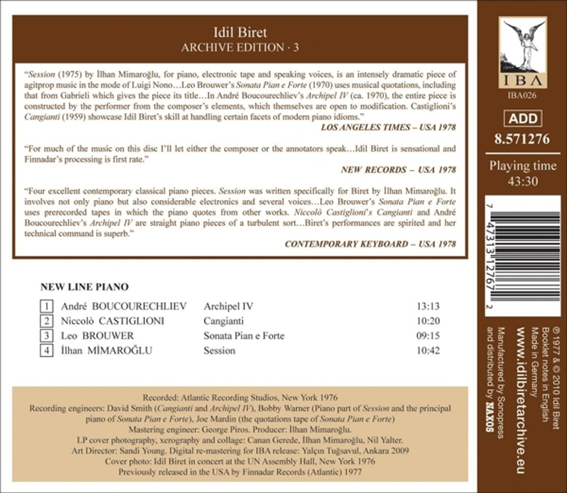 "Four excellent contemporary classical piano pieces. Session was written specifically for Biret by ilhan Mimaroglu. It involves not only piano but also considerable electronics and several voices...Leo Brouwer's Sonata Pian e Forte uses prerecorded tapes in which the piano quotes from other works. Niccolò Castiglioni's Cangianti and André Boucourechliev's Archipel IV are straight piano pieces of a turbulent sort...Biret's performances are spirited and her technical command is superb." CONTEMPORARY KEYBOARD - USA 1978"