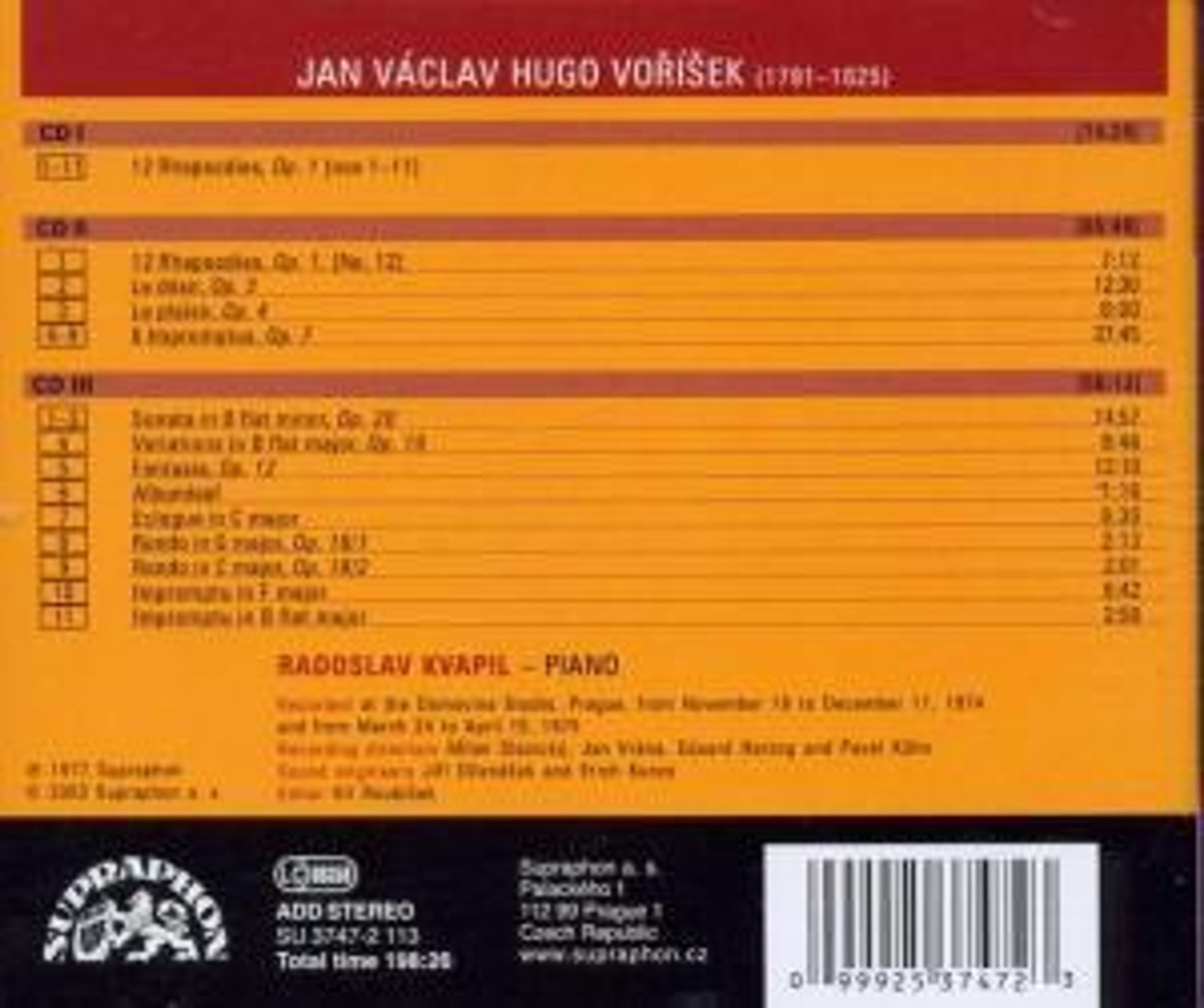 At the time of his death in Vienna, the Czech composer Jan Vaclav Hugo Vorisek (1791 – 1825) was only 34 years old. Apart from studies of composition (with Tomasek in Prague, and with Hummel in Vienna), he had also obtained schooling in Philosophy and Law. In Vienna, where he settled in 1813, his talent was duly recognized, as in 1822 he became organist to the imperial court, a post which ranked him definitively alongside the foremost celebrities of Vienna's music life. The compositional legacy he left behind is not particularly extensive but in terms of artistic value confirms his status as a major composer. His style straddles the borderline between the Classical and the Romantic. There, his keyboard output – whose virtually complete collection (except for two or three unimportant occasional pieces) is being presented here in digital format – already quite obviously augurs the advent of the Romantic era. The honourable task of interpreting the sum of Vorisek's works for the piano was taken up here with success by Radoslav Kvapil, a leading specialist on Czech piano production, whose previous Supraphon projects have included among other titles complete sets of piano works of Leos Janacek and Antonin Dvorak.