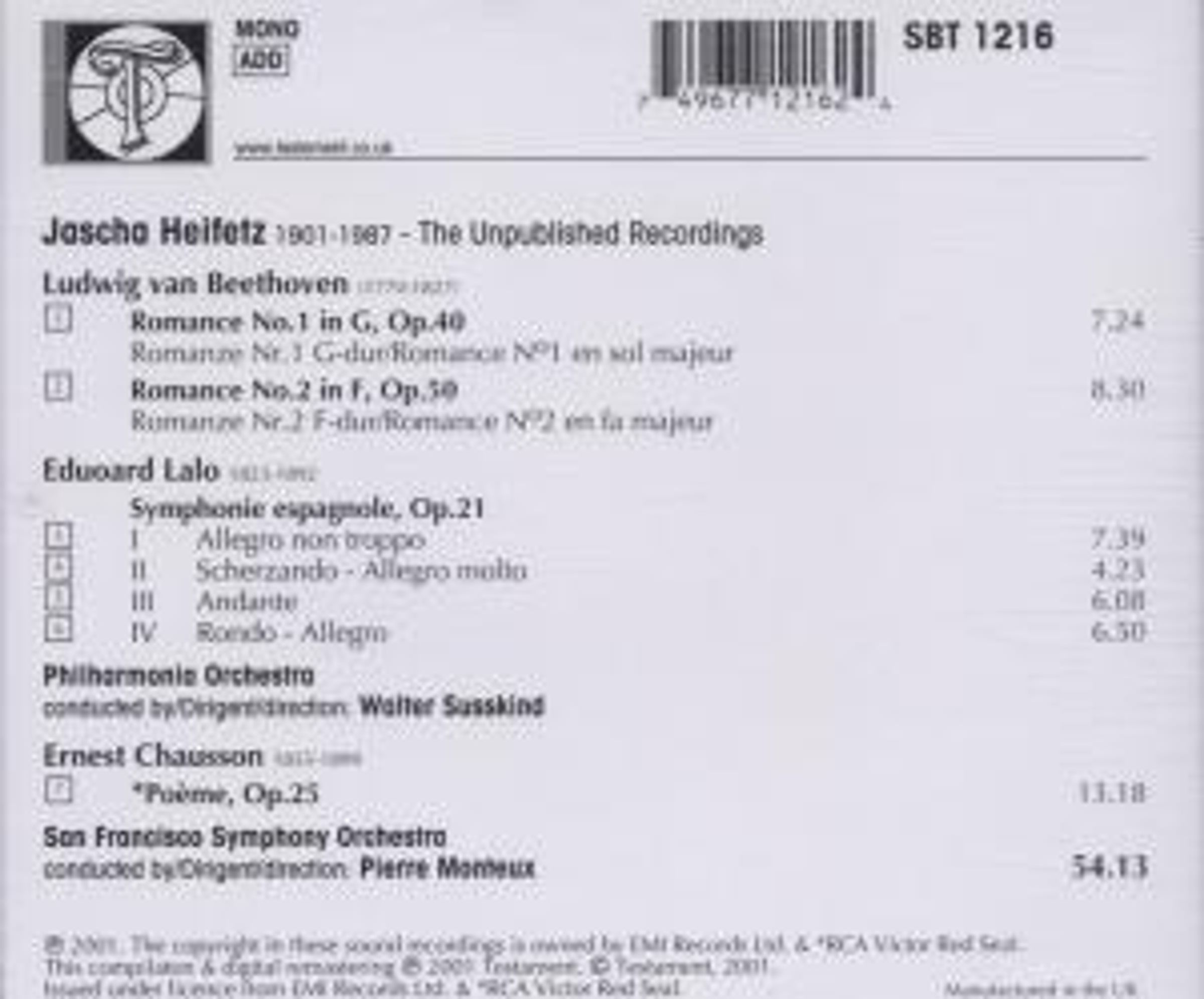- Jascha Heifetz, Philharmonia Orchestra, Walter Susskind (Beethoven & Lalo);SO San Francisco, Pierre Monteux (Chausson)