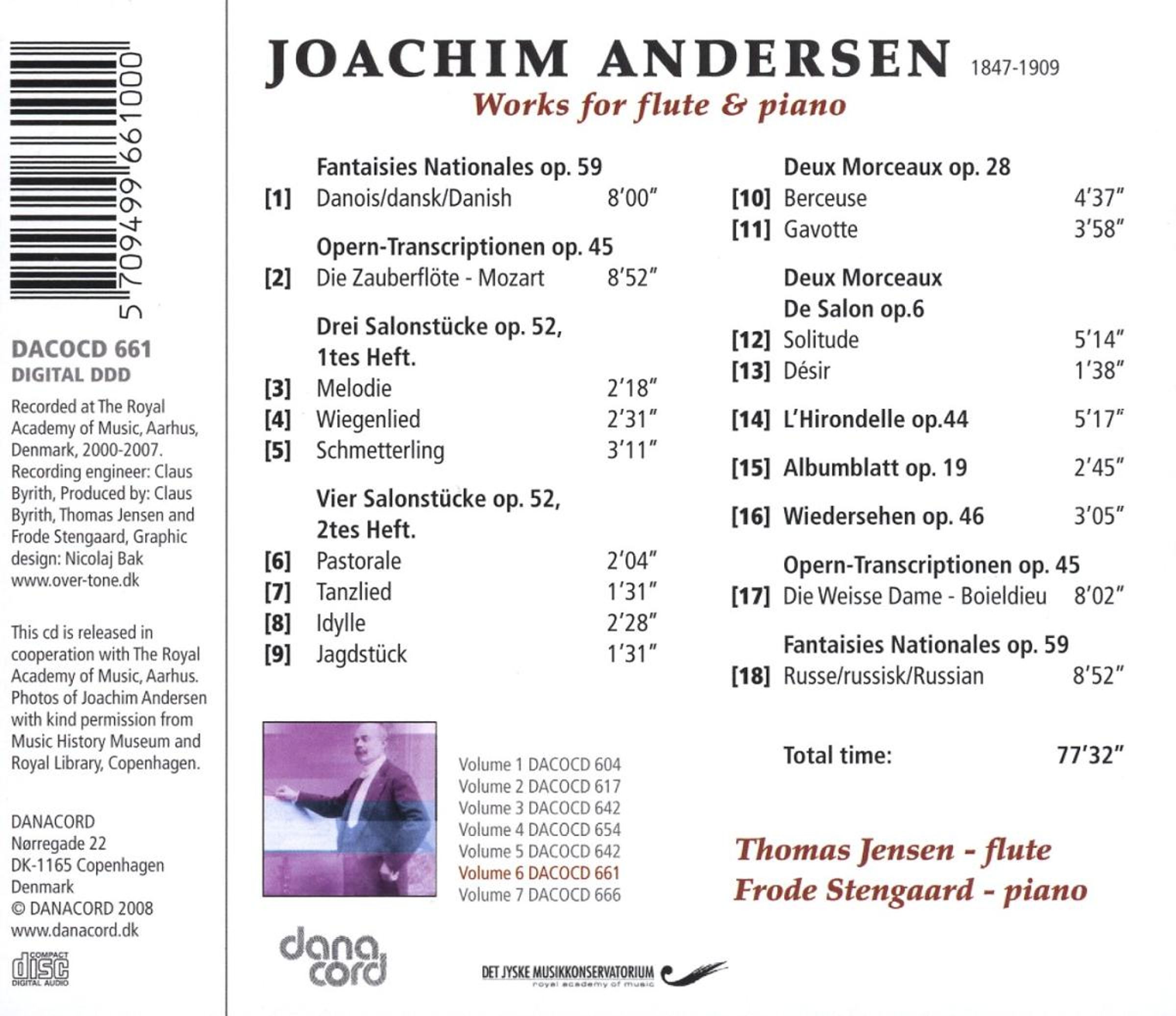 Andersen, einer der besten Flötisten Ausgangs des 19. Jahrhunderts, wird bis heute als Schöpfer der 188 Etüden gefeiert, die abzuarbeiten zur Ausbildung aller Flötenschüler gehört. Seine Karriere führte ihn über Russland nach Deutschland, wo er Gründungsmitglied, Soloflötist und Assistenzdirigent der Berliner Philharmoniker wurde. Elf Jahre später ging er nach Kopenhagen zurück, wo er sich der Entwicklung des musikalischen Lebens in seiner Heimatstadt widmete. 1898 wurde er Leiter des erneuerten Tivoli-Orchesters.