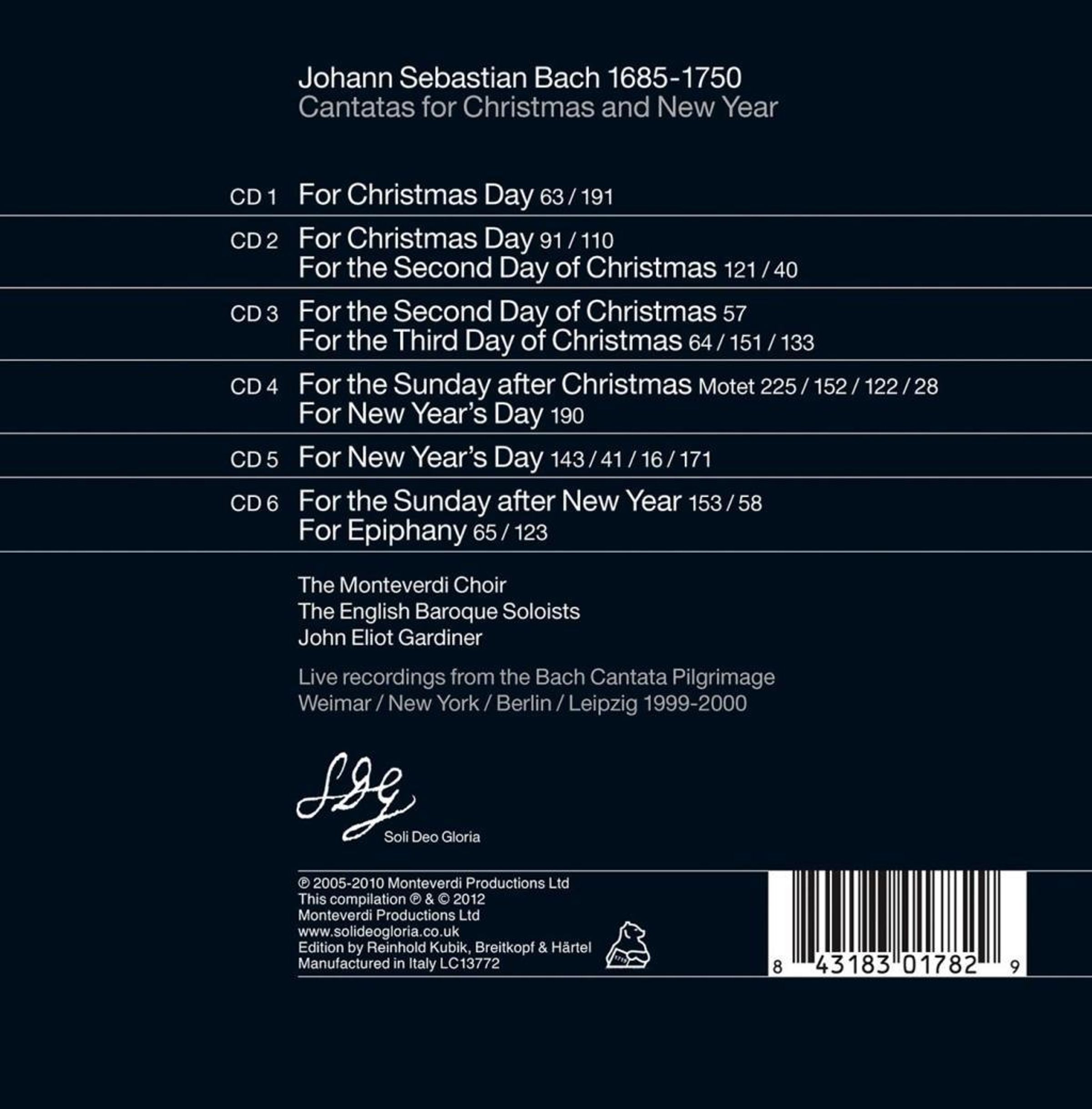 Diese CD-Box enthält sämtliche Bachkantaten der Weihnachtszeit (einschließlich Neujahr und Dreikönigsfest), die John Eliot Gardiner während seiner Bach-Pilgerreise im Jahr 2000 an unterschiedlichen Orten der Welt aufgenommen hat. Auf sechs CDs erklingen so berühmte Kantaten wie »Christen, ätzet diesen Tag«, »Unser Mund sei voll Lachens« oder »Ich freue mich in Dir«. Neben den English Baroque Soloists und dem Monteverdi Choir sind so bedeutende Solisten wie Magdalena Kožená, Bernarda Fink, Michael Chance, James Gilchrist oder Christoph Genz zu hören. Das ausführliche Booklet versammelt die sehr persönlichen und musikalisch-theologisch fundierten Einführungstexte des Dirigenten.