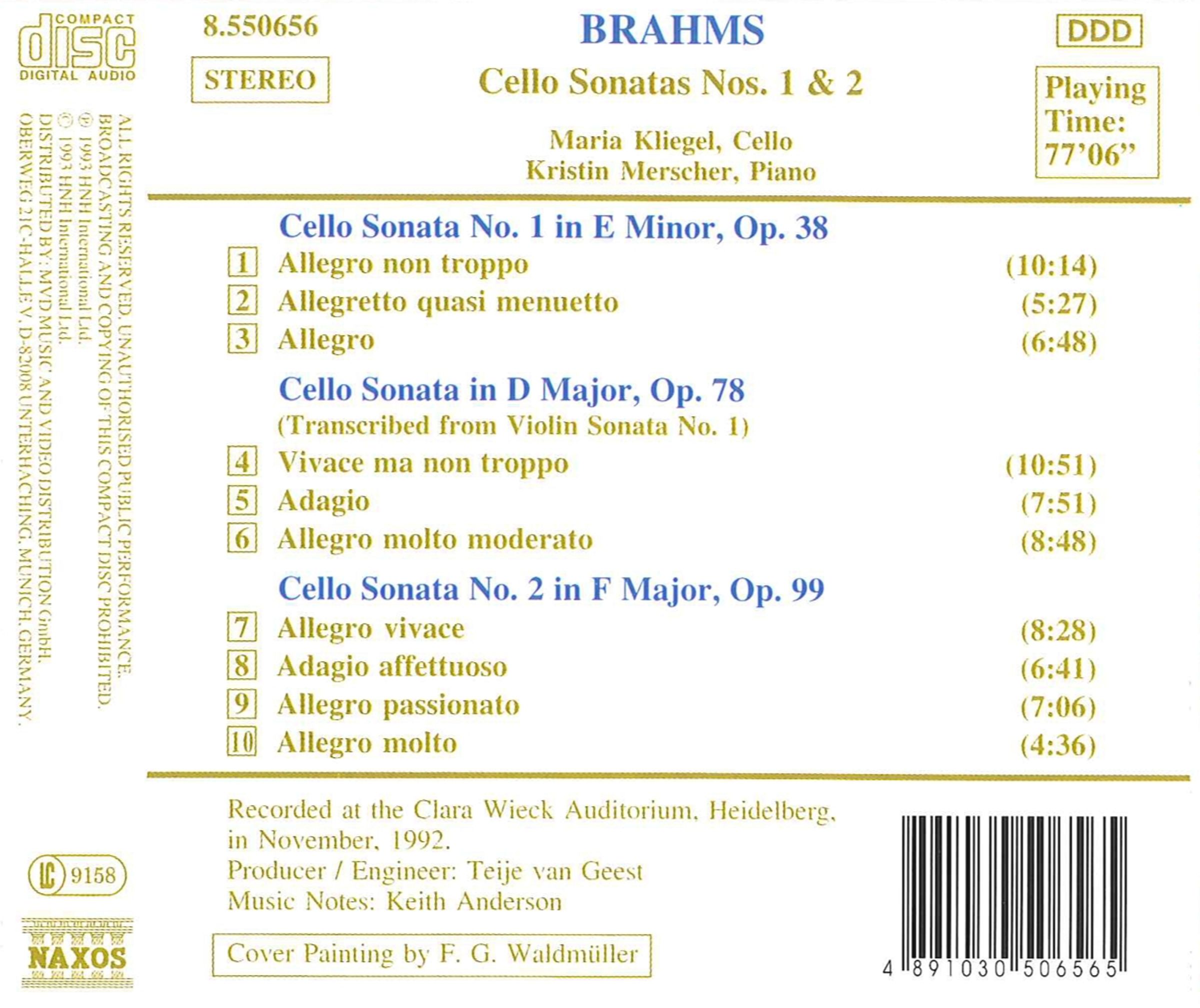Classical-CD 01/94:"Maria Kliegels Tongebung erweist sich als absolut richtig für Brahms: melodisch,mühelos virtuos,mit elegischem Charakter. All das sorgt für eine exzellente und bewegende Interpretation...In Kristin Merscher hat sie eine gleichermaßen hervorragende Begleiterin. Eine erfreuliche,vorzügliche und mit 77 Minuten sehr großzügige CD."Disk 1 von 1 (CD)