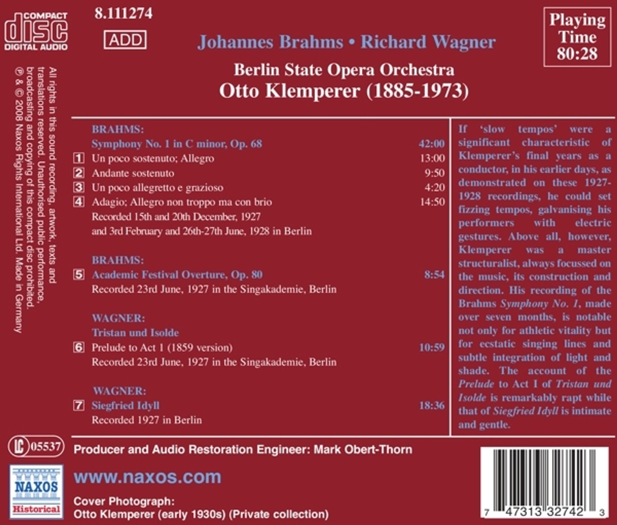 If 'slow tempos' were a significant characteristic of Klemperer's final years as a conductor, in his earlier days, as demonstrated on these 1927-1928 recordings, he could set fizzing tempos, galvanising his performers with electric gestures. Above all, however, Klemperer was a master structuralist, always focused on the music, its construction and direction. His recording of the Brahms Symphony No. 1, made over seven months, is notable not only for athletic vitality but for ecstatic singing lines and subtle integration of light and shade. The account of the Prelude to Act I of Tristan und Isolde is remarkable rapt while that of Siegfried Idyll is intimate and gentle.