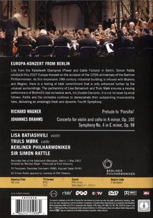 Das legendäre Europakonzert 2007 aus der alten Kabelfabrik im Herzen Berlins. Brahms‘ Doppelkonzert mit Lisa Batiashvili und Truls Mørk als Solisten. Simon Rattle dirigiert die grandiosen Berliner Philharmoniker. Die Wiederveröffentlichungen als Budgetversion mit dem Cover des jungen Künstlers Kazuki Nakahara beinhaltet den neuen EuroArts & Idéale Audience Katalog mit allen Veröffentlichungen 2013.
