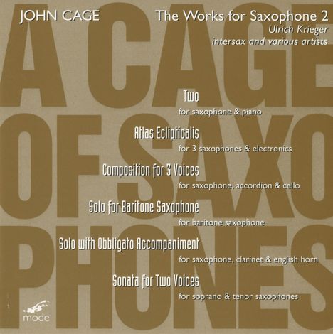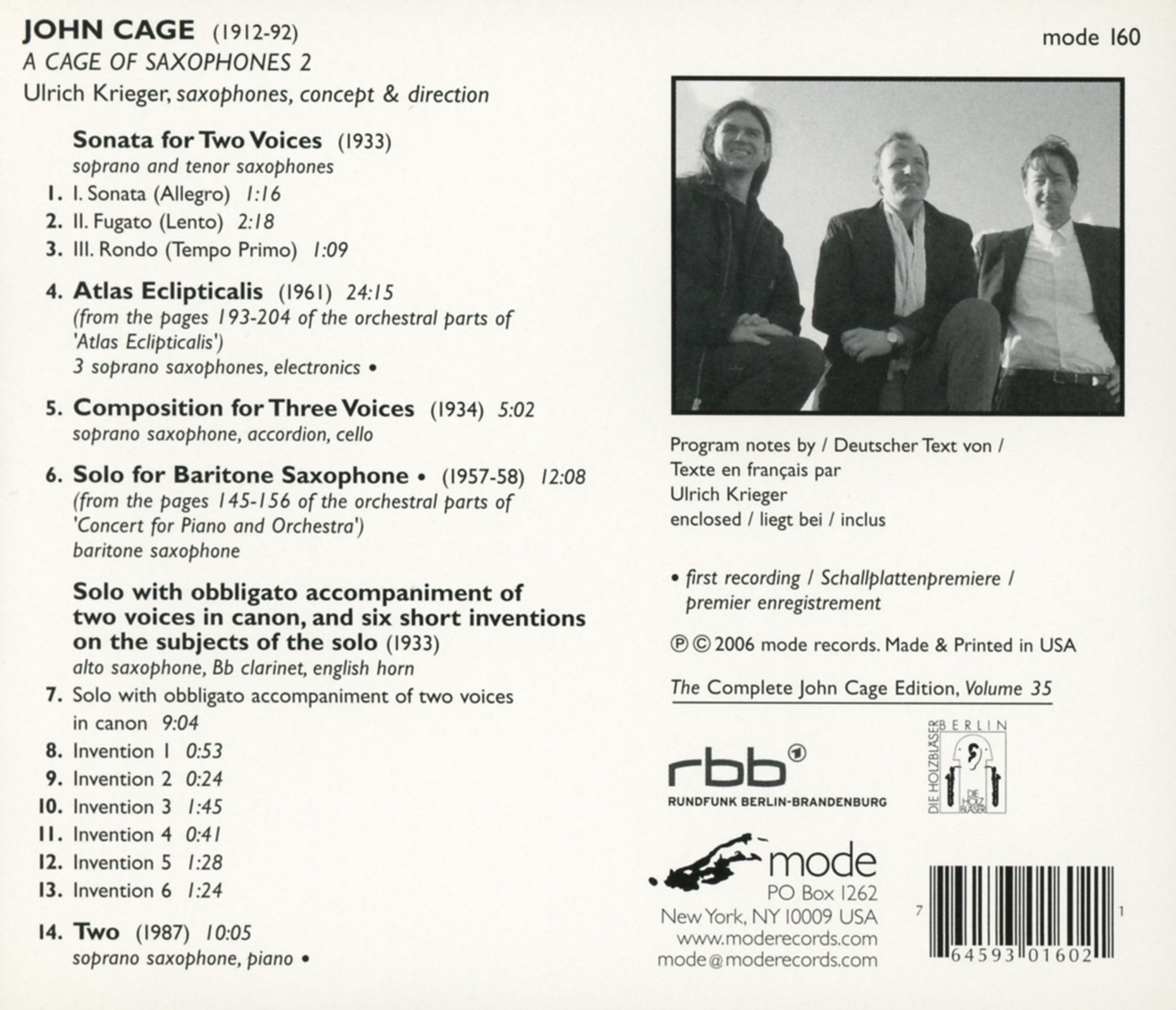 Sonate für 2 Stimmen; Solo with Obbligato Accompaniment of 2 Voices in Canon, and 6 Short Inventions on the Subject of the Solo; Composition for 3 Voices; Solo für Saxophon aus dem Klavierkonzert; Atlas Eclipticalis; Two für Saxophon & Klavier