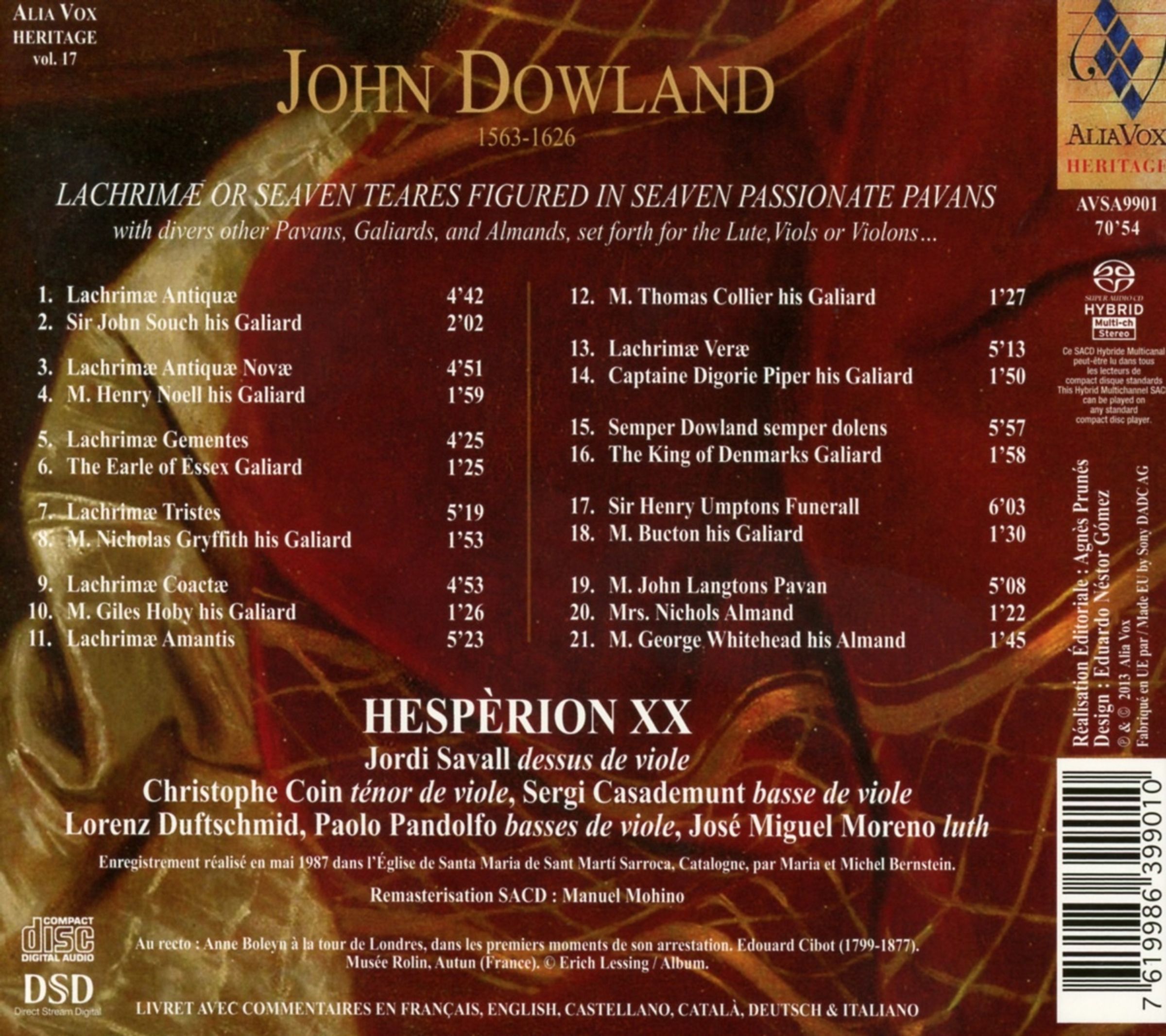 Dowlands »Lachrimæ« basieren auf seinem Lautenlied »Flow My Tears« – daher der Zusatz »Seaven Teares Figured in Seaven Passionate Pavans« – und wurden für fünf Gamben und Laute gesetzt. Sie werden von Galliarden und Allemanden kontrastiert. Jordi Savalls vielfach ausgezeichnete Aufnahme von 1987 ist der Grundstein jeder Dowland-Diskografie und liegt nun zum ersten Mal in einer überarbeiteten Mehrkanalton-Aufnahme vor.