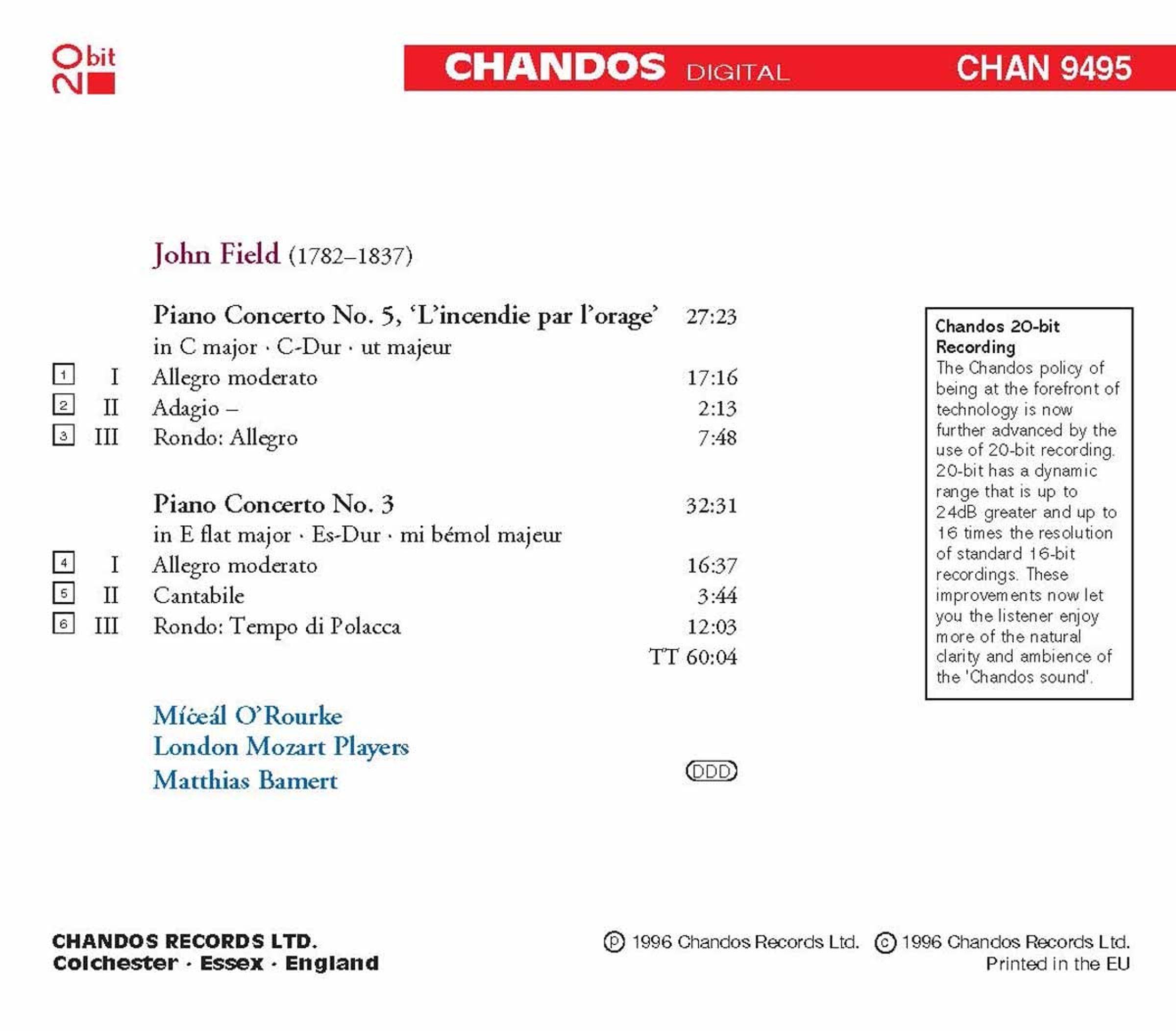 M. Keller in FonoForum 5/97: "Glänzend disponiert und unter besten aufnahmetechnischen Bedingungen setzen O'Rourke und die London Mozart Players unter Matthias Bamert hier ihr John-Field-Kompendium fort."Tracklisting