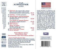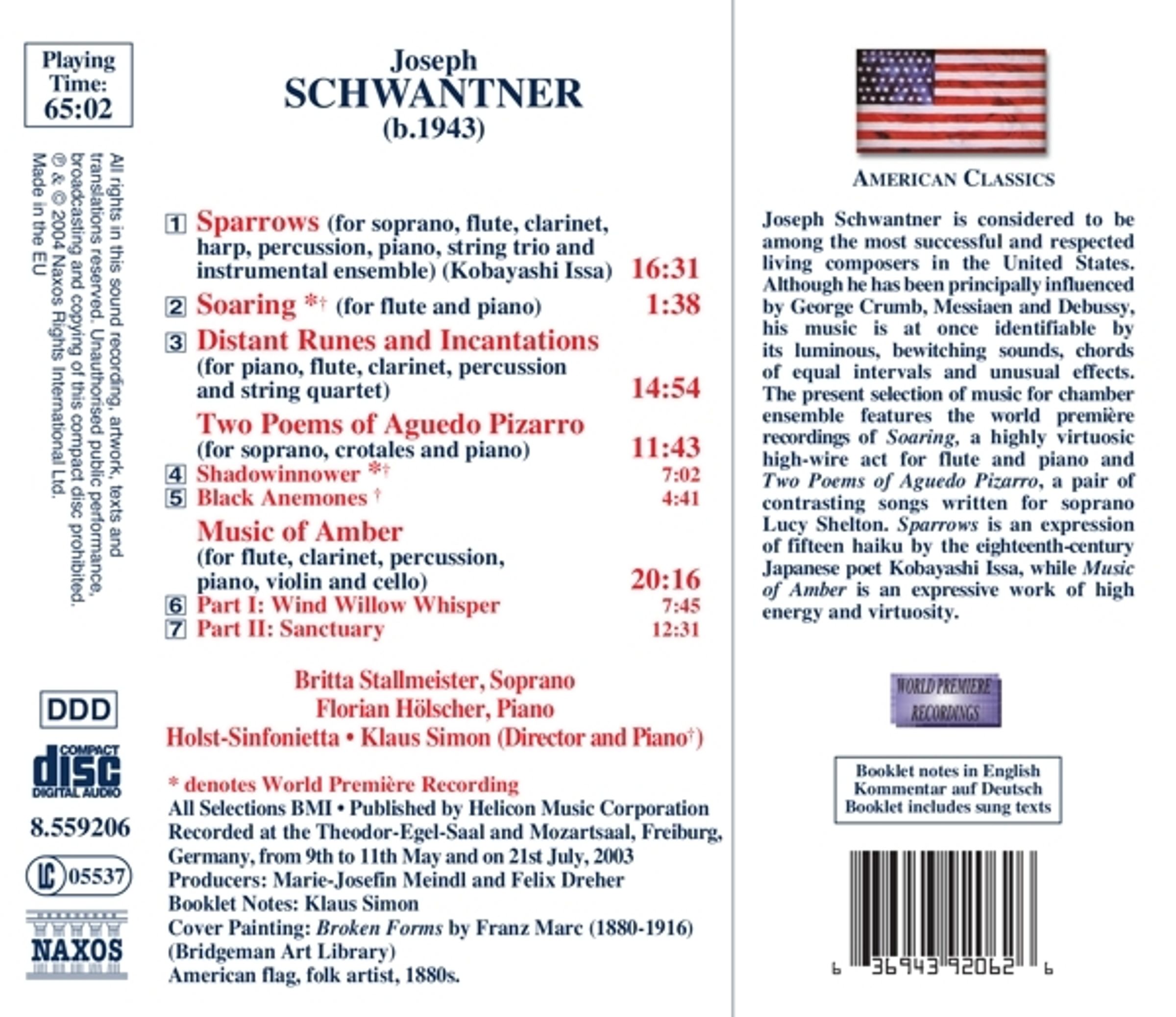 Joseph Schwantner gilt heute als einer der bedeutendsten Komponisten der Vereinigten Staaten. Er wurde unter anderem von George Crumb, Messiaen und Debussy beeinflusst. »Sparrows«, das auf dieser CD enthalten ist, besteht aus Gedichten des japanischen Dichters Kobayashi Issa aus dem 18. Jahrhundert.