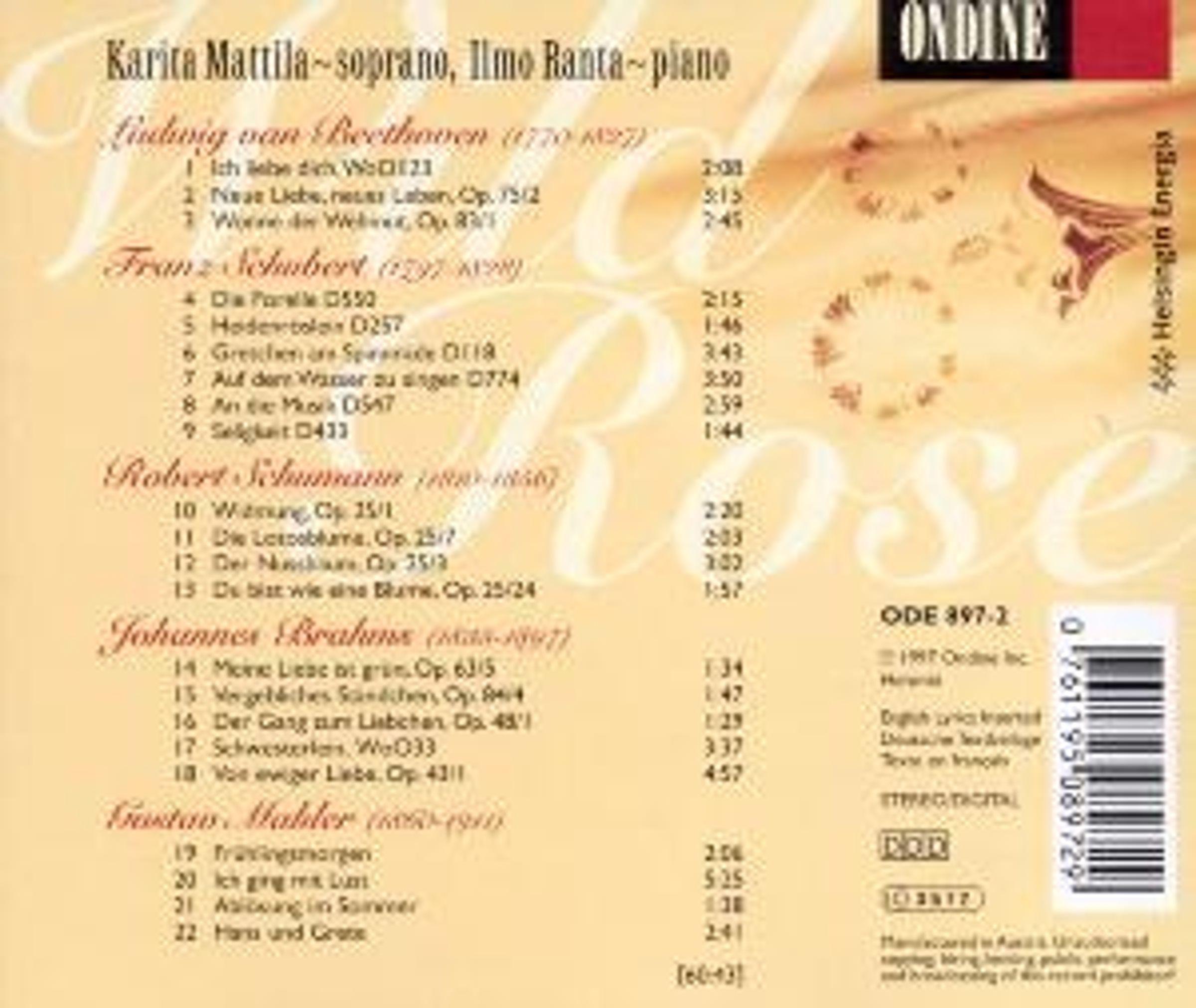 Auf diesem Album präsentiert die finnische Sopranistin Karita Mattila deutsche Kunstlieder aus der Klassik und Romantik. Enthalten sind berühmte Lieder von Beethoven, Schubert, Schumann und Brahms sowie frühe Lieder mit Klavier von Mahler. Karita Mattila wird von Ilmo Ranta am Klavier begleitet.