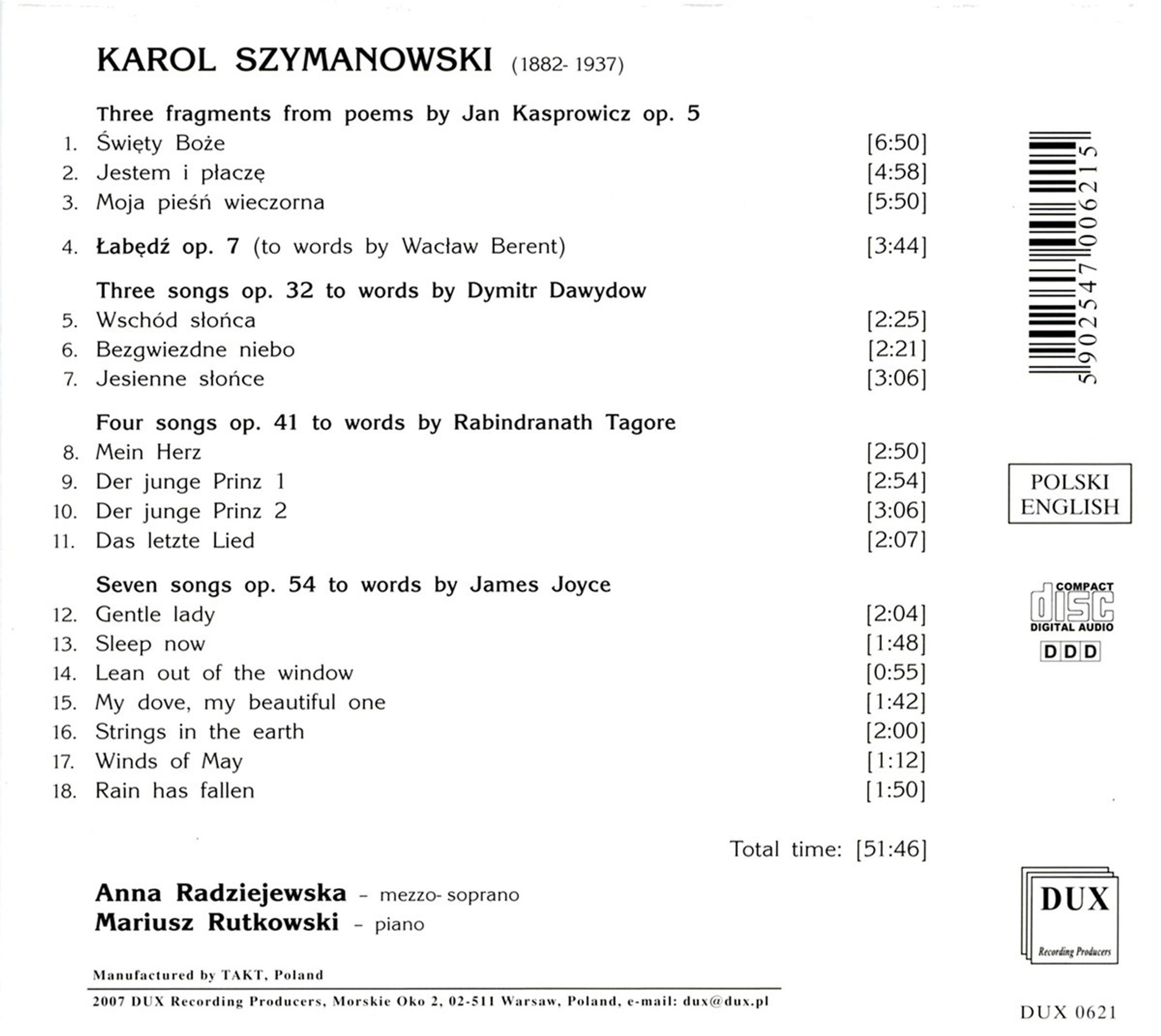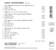 3 Fragmente nach Gedichten von Jan Kasprowicz op. 5; Labedz op. 7; 3 Lieder nach Dymitr Dawydow op. 32; 4 Lieder nach Rabindranath Tagore op. 41; 7 Lieder nach James Joyce op. 54