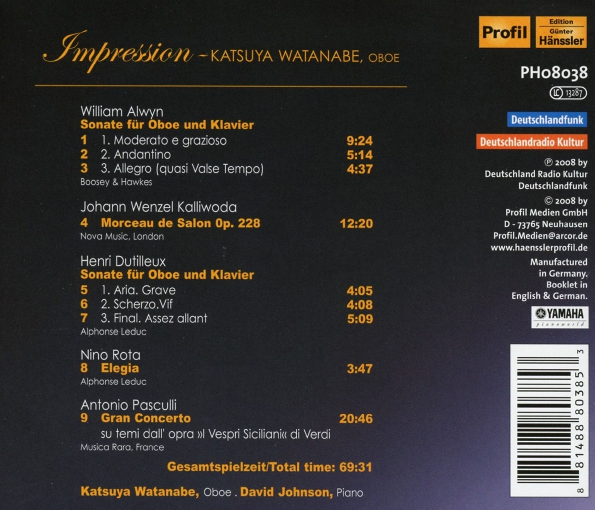 FonoForum 10/08: "Von den Klangkolorierungen des malenden Briten William Alwyn bis hin zum spektakulären Opern-Belcanto und der aberwitzigen Virtuosität des Sizilianers Antonio Pasculli zelebriert das Duo Watanabe/Johnson die hohe Kunst des Oboespiels und kammermusikalischen Miteinanders gleichermaßen. Was Watanabe hier an dynamischer Vielfalt, tonlicher Delikatesse und technischer Brillanz hören lässt, ist kaum zu überbieten."Disk 1 von 1 (CD)