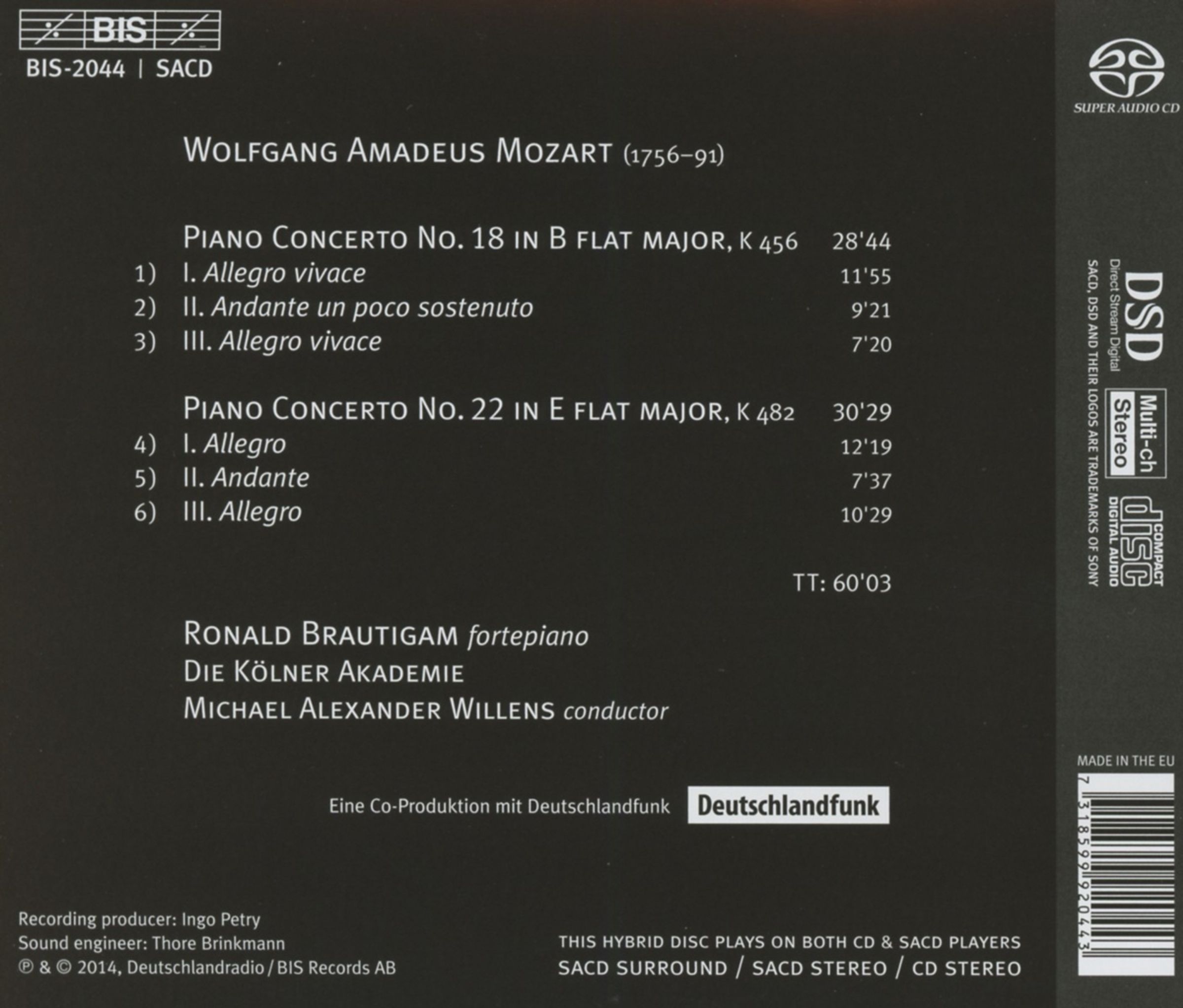 Die sechste SACD in dieser überaus erfolgreichen Serie kombiniert zwei Werke, in denen Mozarts Meisterschaft der Orchestrierung besonders deutlich wird. Das Konzert Nr. 18 wird gelegentlich als eines seiner „militärischen“ Konzerte bezeichnet wegen des marschähnlichen Themas des ersten Satzes. Virtuos geht Mozart mit dem Einsatz der verschiedenen Orchestergruppen (Streicher, Bläser, und natürlich das Klavier) um. Das fiel natürlich auch seinem Vater Leopold auf; in einem Brief an Nannerl schrieb er 1785, Wolfgang habe „ein herrliches Concert“ gespielt. „Ich hatte das vergnügen alle Abwechslungen der Instrumente so vortrefflich zu hören, dass mir vor Vergnügen die Tränen in den Augen standen.“