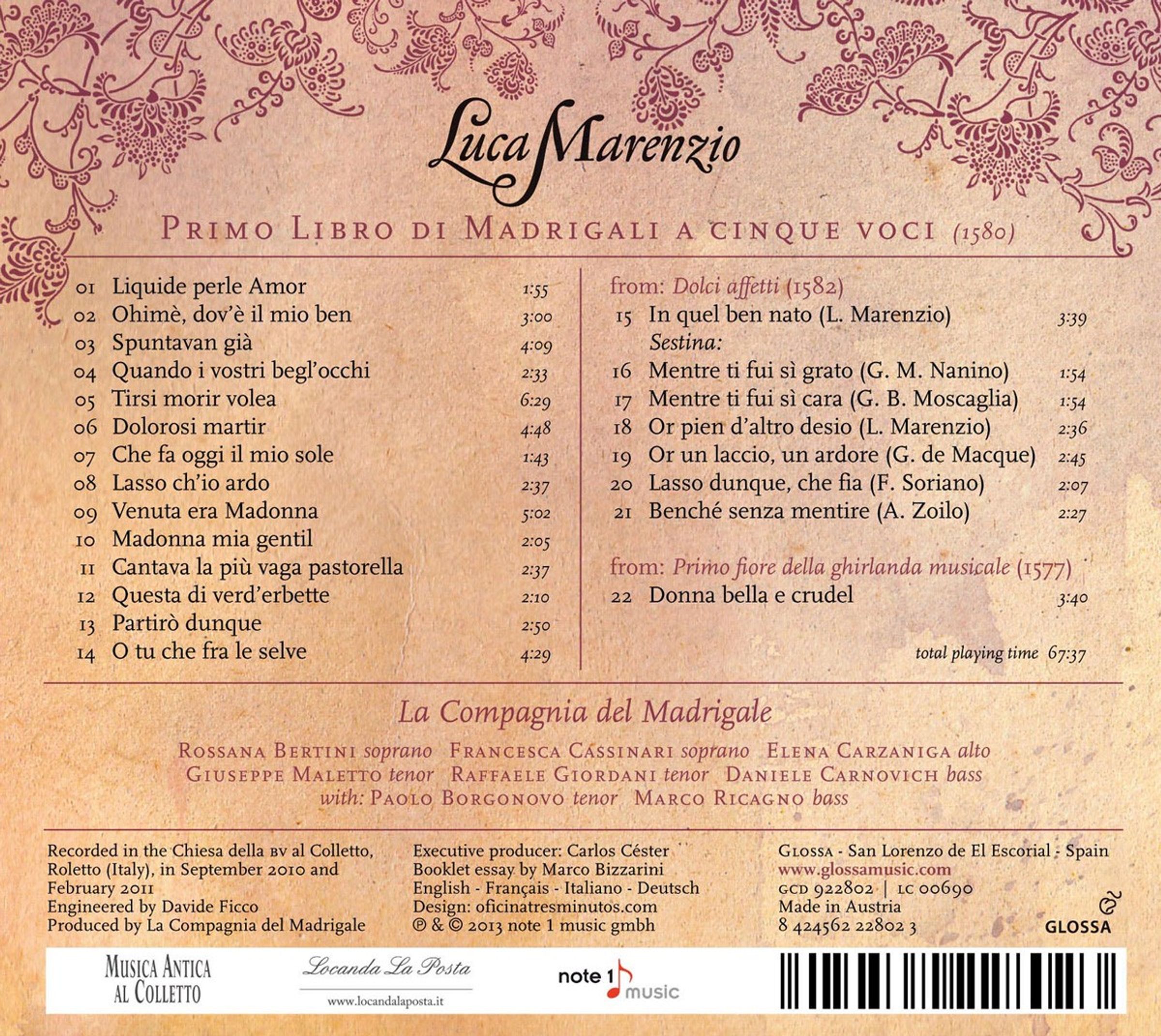 Die 'Compagnia del Madrigale' zeigt auch in ihrer jüngsten GLOSSA-Einspielung, wie klangvoll und farbenreich sie italienische Madrigale zu interpretieren versteht. Die Aufnahme lässt das römische Dolce Vita des späten 16. Jahrhunderts wieder aufleben; Musik und Texte in Marenzios erstem Madrigalbuch beschwören jenes goldene Zeitalter der Kunst und der Wissenschaft herauf, in dem Kardinäle und Fürsten prachtliebende Mäzene waren.