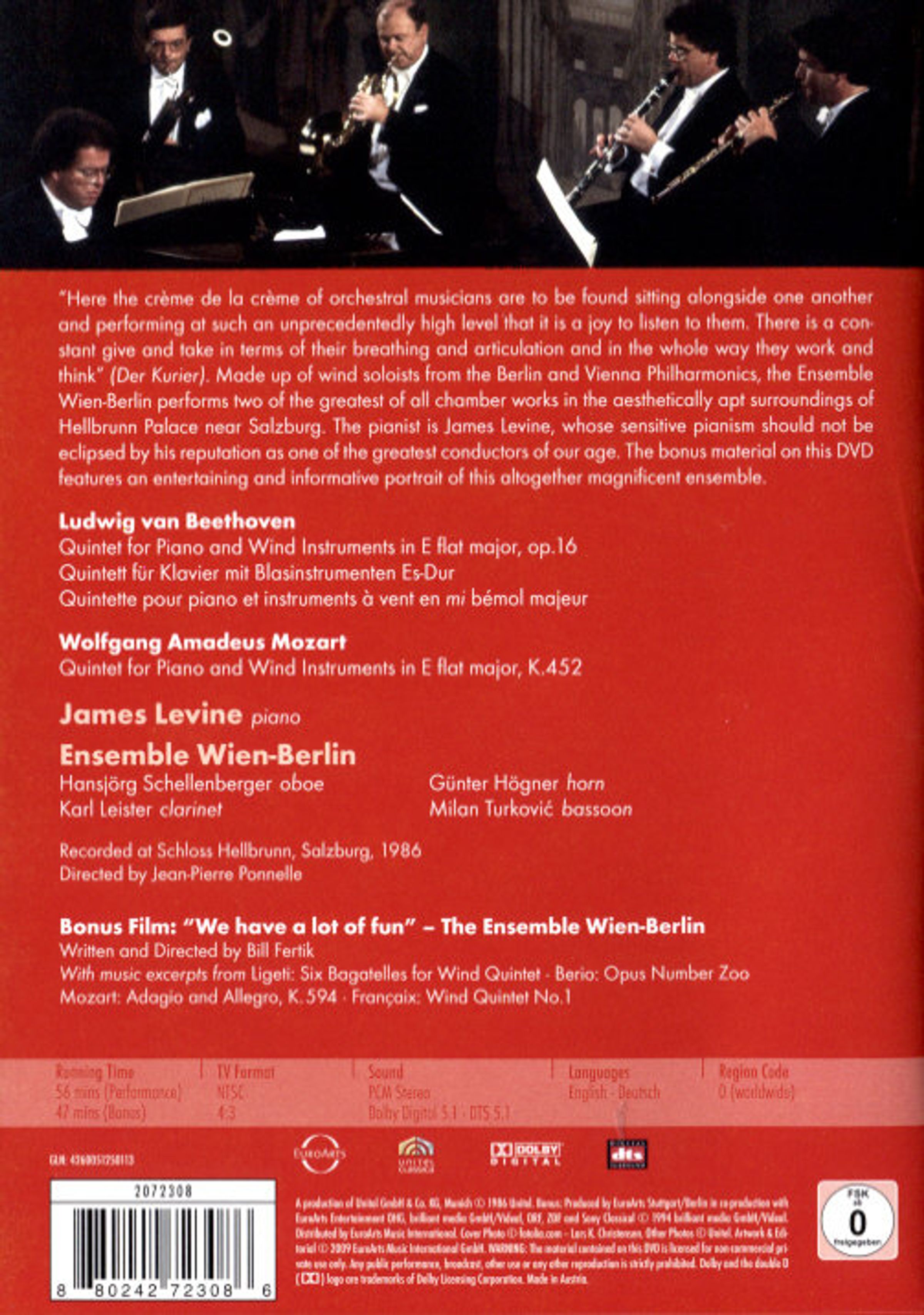 Das Ensemble Wien-Berlin, das aus den hochkarätigen Solisten der Berliner und der Wiener Philharmoniker besteht, spielen die beiden Meisterwerke im stilgerechten Ambiente von Schloss Hellbrunn bei Salzburg im Dialog mit James Levine, dessen sensitive pianistische Begabung allzu leicht von seiner dirigentischen Prominenz überschattet wird.