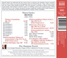 Kurz bevor der freiberufliche „concertista d’organo“ Marco Enrico Bossi seine letzte Konzertreise nach Amerika antrat, erhielt er regen Zuspruch von seinem Freund Puccini: „Sie werden schon hören, wie eine Orgel wirklich gespielt werden muss.“ Auf dieser CD wird Ihnen eine Auswahl von Bossis bemerkenswerter Orgelmusik präsentiert, die – ob leise und intim oder geradezu aufwühlend – immer von einzigartiger künstlerischer Sensibilität und sowohl César Franck und Claude Debussy als auch der Deutschen symphonischen Tradition verpflichtet ist.