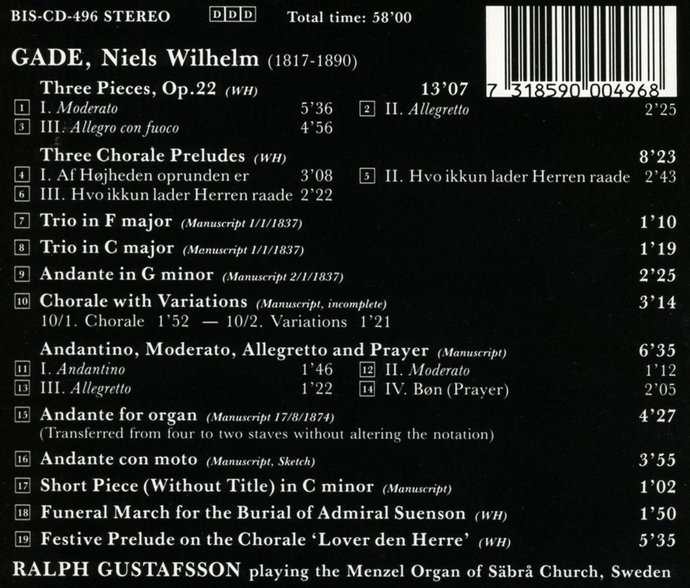 3 Stücke op. 22; 4 Choralpräludien; Trios F-dur & G-dur; Andante g-moll; 2 Choralvariationen; Andantino, Moderato, Allegretto & Prayer; Andante; Andante con moto; Kurzes Stück; Trauermarsch f. Admiral Suenson