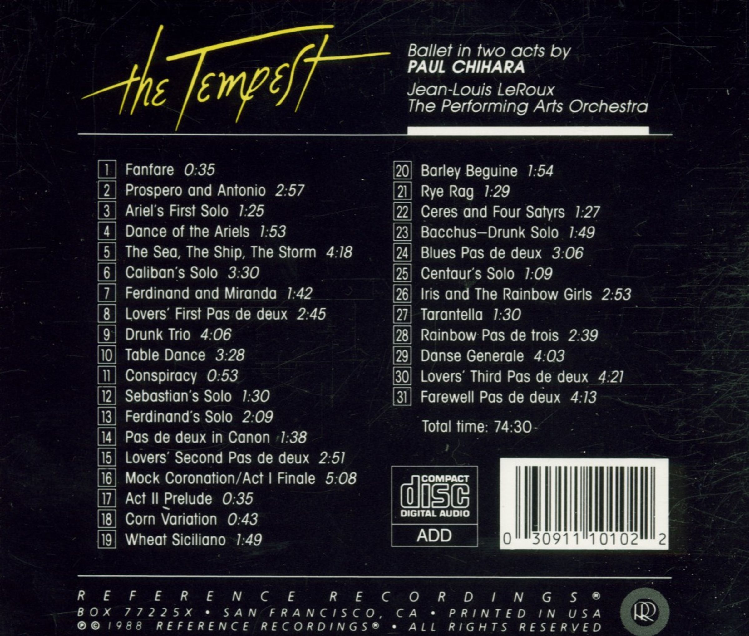 Diese Komposition für ein Ballett nach dem Shakespeare-Stück “The Tempest” (“Der Sturm”) schrieb der Amerikaner Paul Chihara nach Themen des englischen Komponisten Henry Purcell. Die Uraufführung des von Jean-Louis LeRoux dirigierten Stücks fand am 13. Mai 1980 durch das San Francisco Ballet statt. Keith Johnson fertigte den vorliegenden Mitschnitt der Premiere an – in gewohnt herausragender klanglicher Qualität.