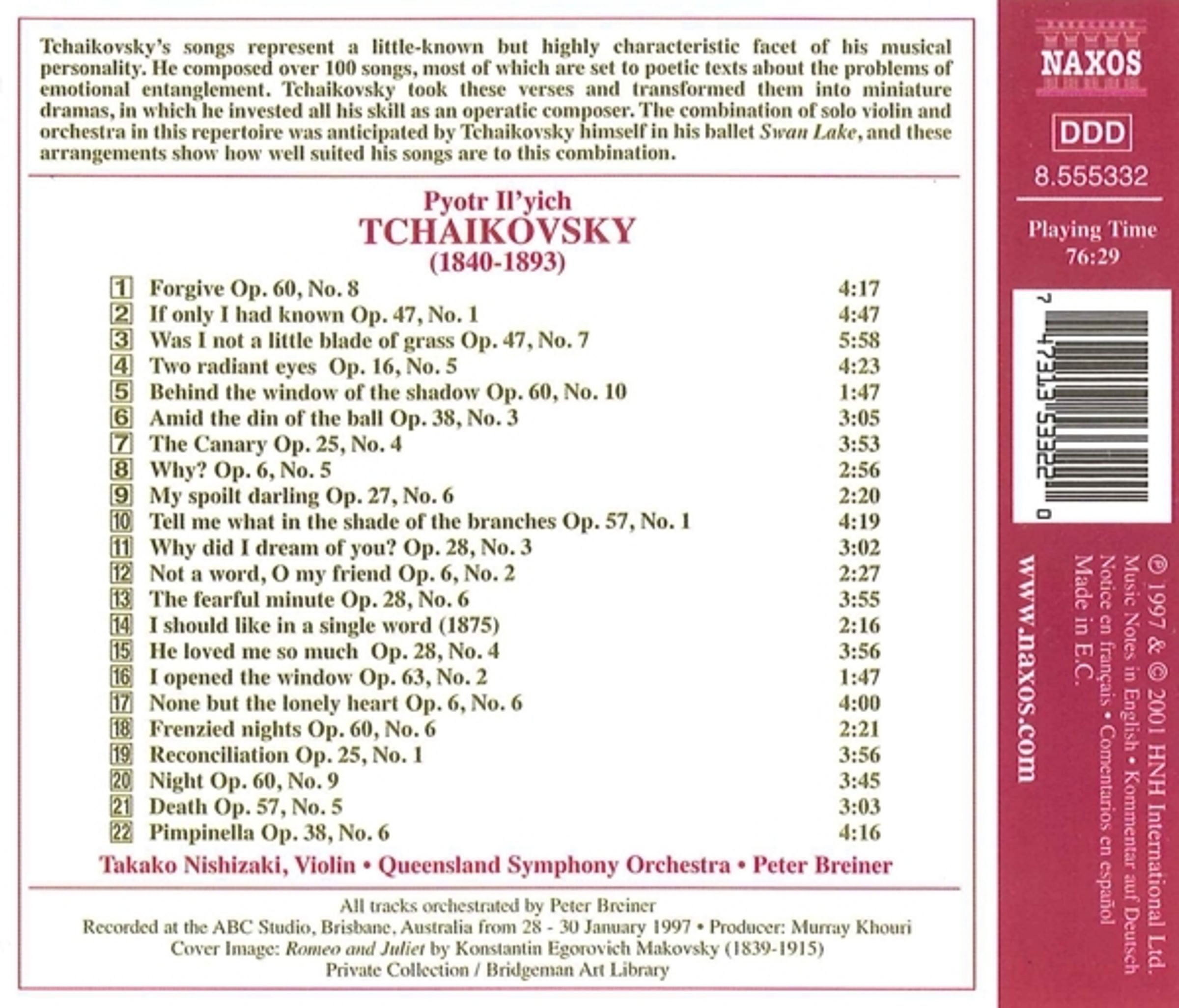 Tschaikowskys Lieder repräsentieren eine zwar wenig bekannte, jedoch in hohem Masse charakteristische Facette seiner Komponistenpersönlichkeit: Er schuf über 100 Lieder zu poetischen Texten, die emotionale Verwicklungen zum Thema haben. Peter Breiner, der diese Einspielung auch dirigiert, hat eine Auswahl für Solovioline und Orchester bearbeitet.