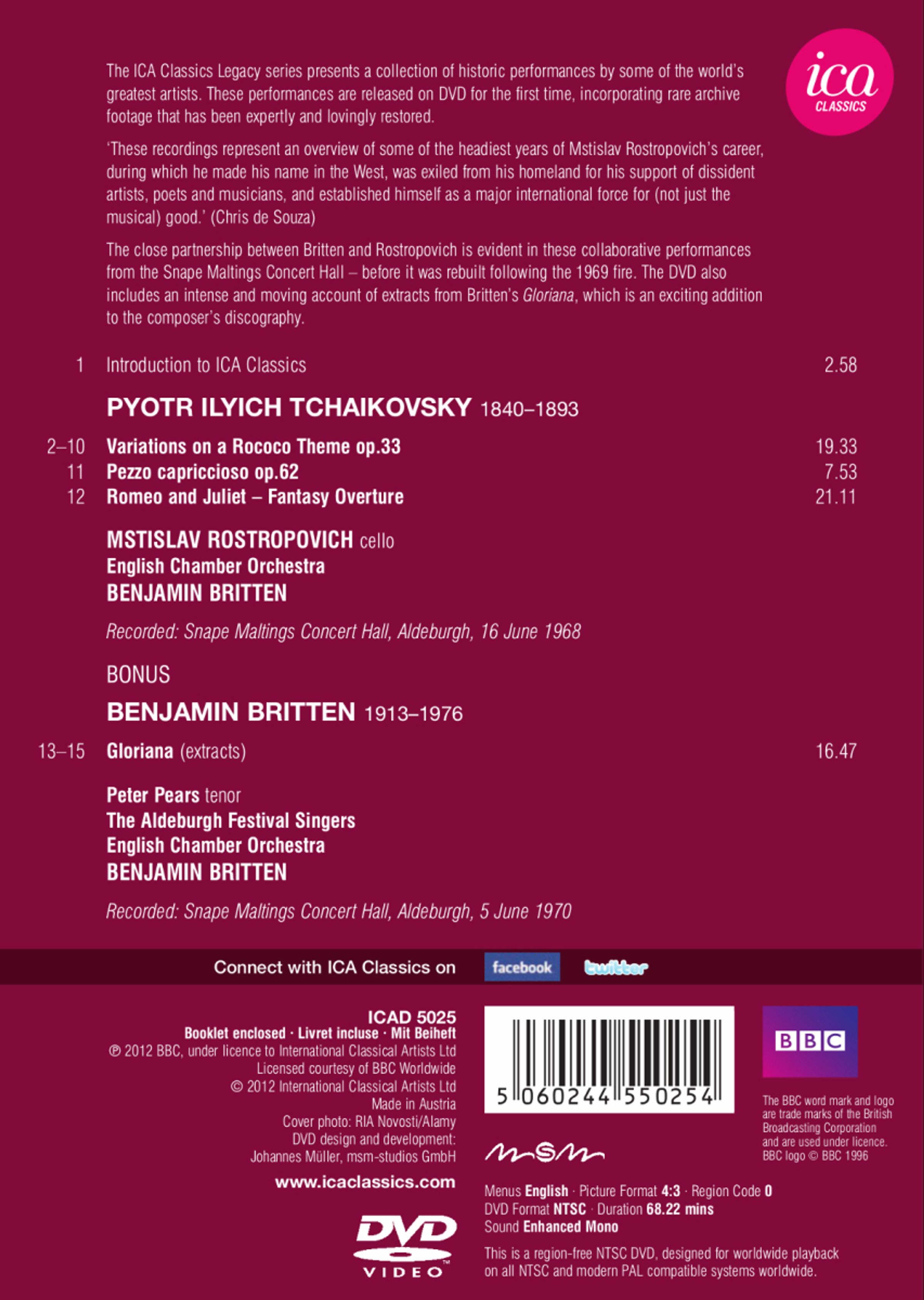 Diese Aufnahmen geben einen Überblick über einige der aufregendsten Jahre in Mstislaw Rostropowitschs Karriere. Rostropowitsch lernte Britten durch Schostakowitsch kennen und schloss eine enge Partnerschaft mit dem britischen Komponisten, der sich von dem russischen Cellisten zu mehreren bedeutenden Cellokompositionen inspirieren ließ. Diese besondere Beziehung wird hier in ihren gemeinsamen Auftritten beim Eröffnungskonzert der neuen Snape Maltings Concert Hall deutlich, die seltenes audiovisuelles Filmmaterial der Maltings enthält, bevor sie 1969 durch einen Brand zerstört und wieder aufgebaut wurde.