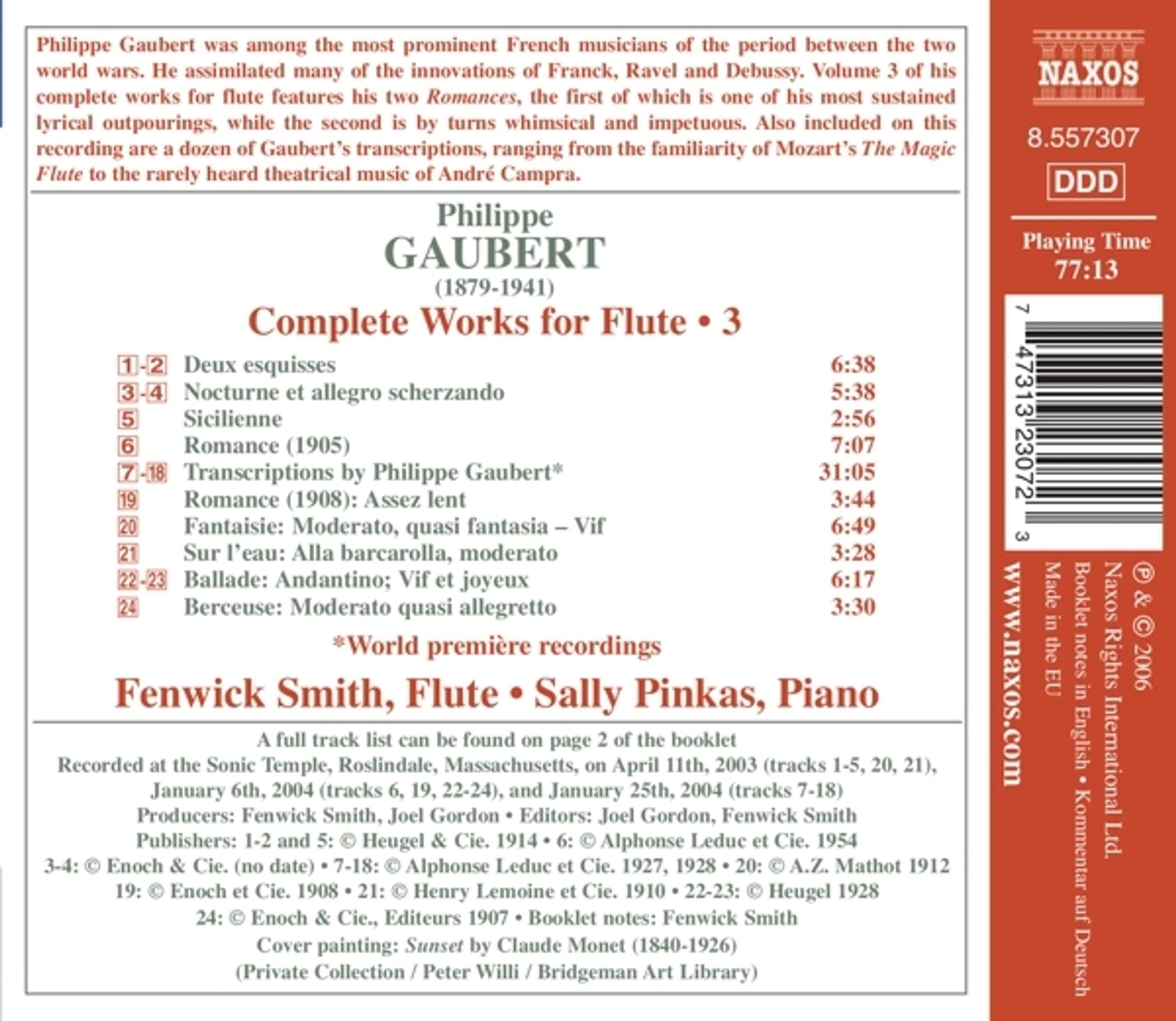 Philippe Gaubert (1879–1941) war einer der bedeutendsten französischen Musiker in der Zeit zwischen den beiden Weltkriegen. Hier sind seine beiden Romanzen enthalten, von denen die erste eines von Gauberts lyrischsten Stücken ist. Außerdem sind mehrere Transkriptionen von Stücken von Komponisten wie Chopin, Mozart und Schumann enthalten.