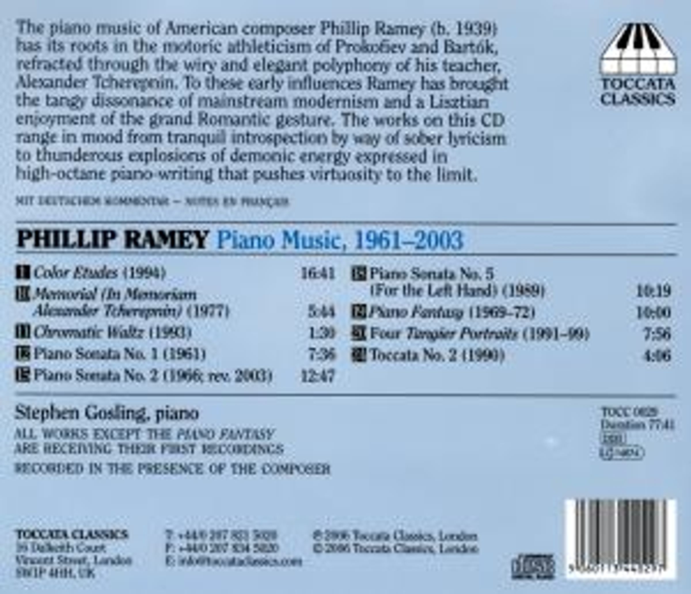 Die Klaviermusik des amerikanischen Komponisten Phillip Ramey (geb. 1939) hat ihre Wurzeln in der motorischen Sportlichkeit von Prokofjew und Bartók, gebrochen durch die drahtige und elegante Polyphonie seines Lehrers Alexander Tcherepnin.