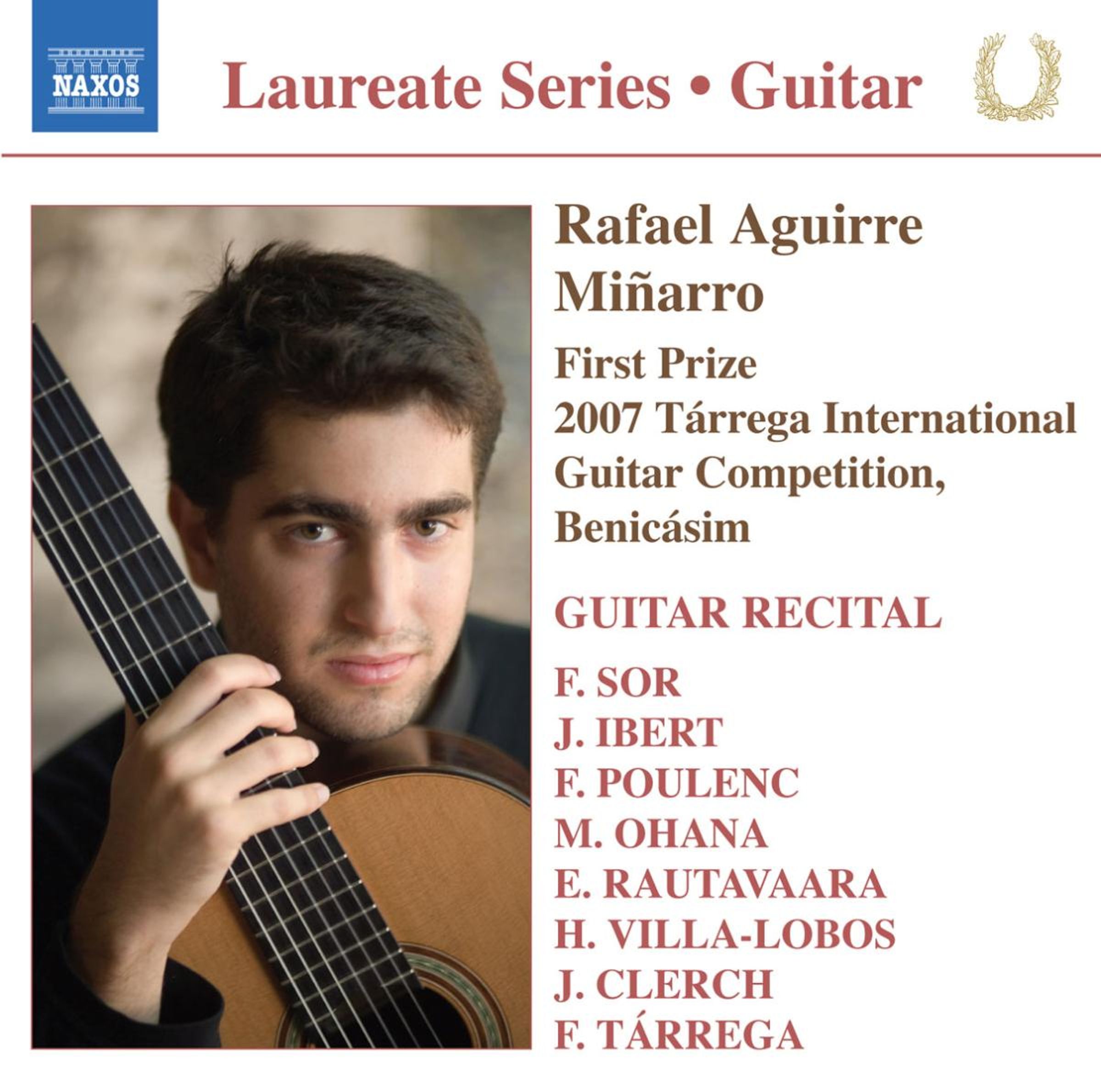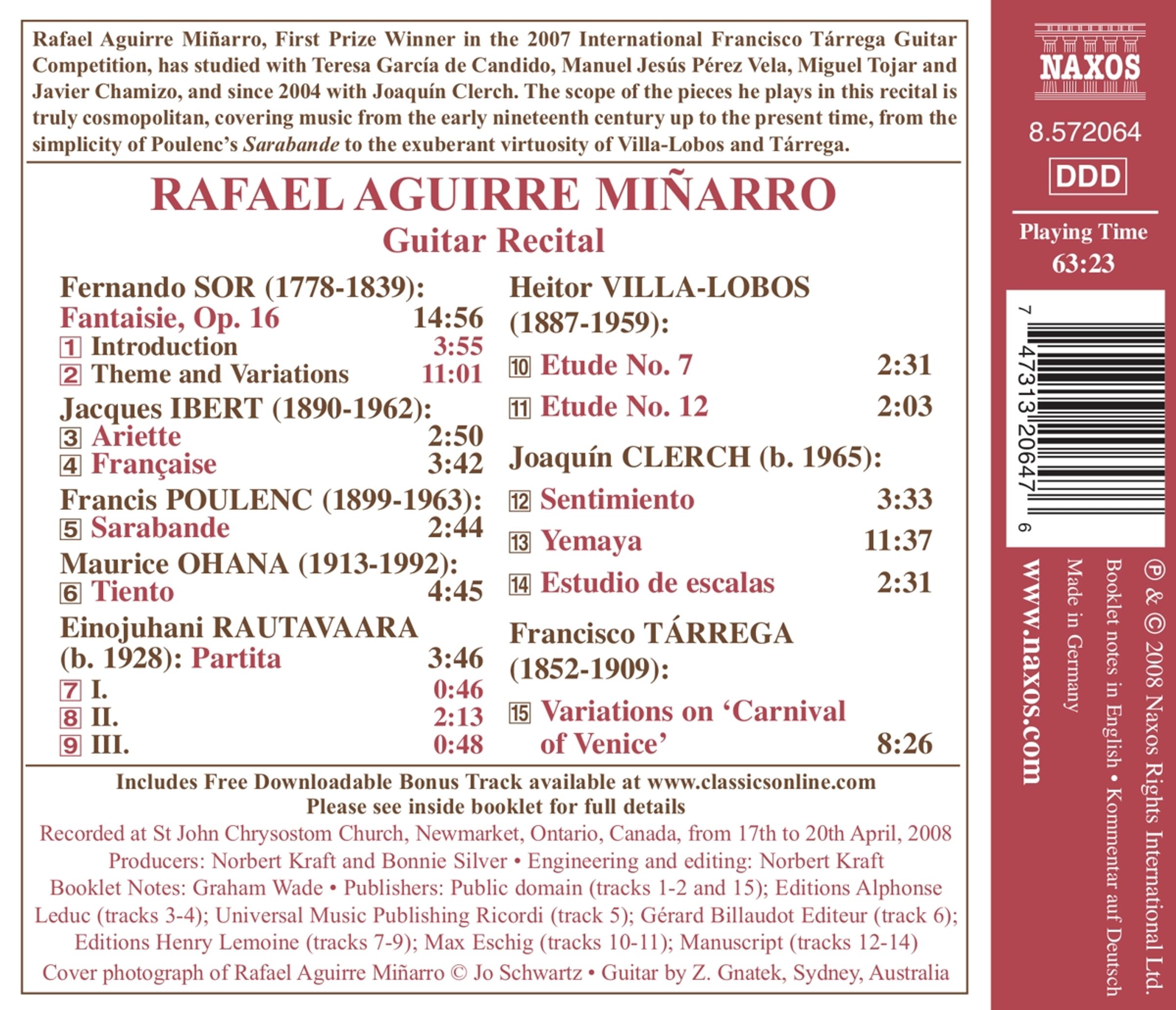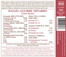 Rafael Aguirre Miñarro, First Prize Winner in the 2007 International Francisco Tárrega Guitar Competition, has studied with Teresa García de Candido, Manuel Jesús Pérez Vela, Miguel Tojar and Javier Chamizo, and since 2004 with Joaquín Clerch. The scope of the pieces he plays in this recital is truly cosmopolitan, covering music from the early nineteenth century up to the present time, from the simplicity of Poulenc's Sarabande to the exuberant virtuosity of Villa-Lobos and Tárrega.