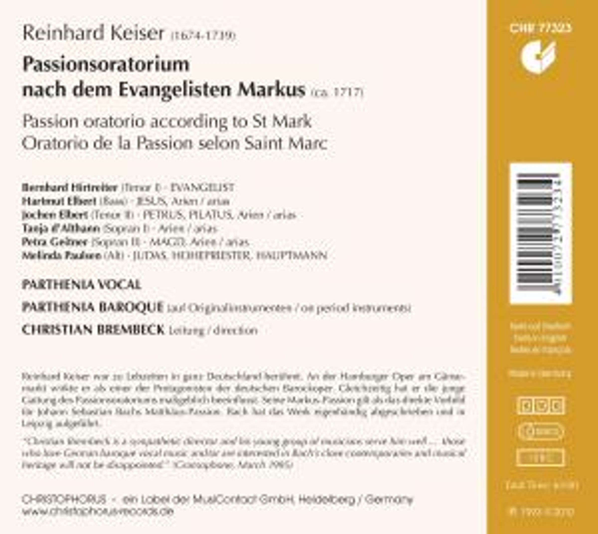 Keiser genoss zu Lebzeiten als Opernkomponist in ganz Deutschland Berühmtheit und beeinflusste auch die junge Gattung des Passionsoratoriums maßgeblich. Seine um 1717 entstandene Markus-Passion profitiert hörbar von seiner Erfahrung als Opernkomponist. Überliefert ist sie übrigens in einer Abschrift von Johann Sebastian Bach, der sie in Leipzig aufführte. Die fesselnde Einspielung von 1993, lange Zeit nicht erhältlich, besitzt nach wie vor Gültigkeit.