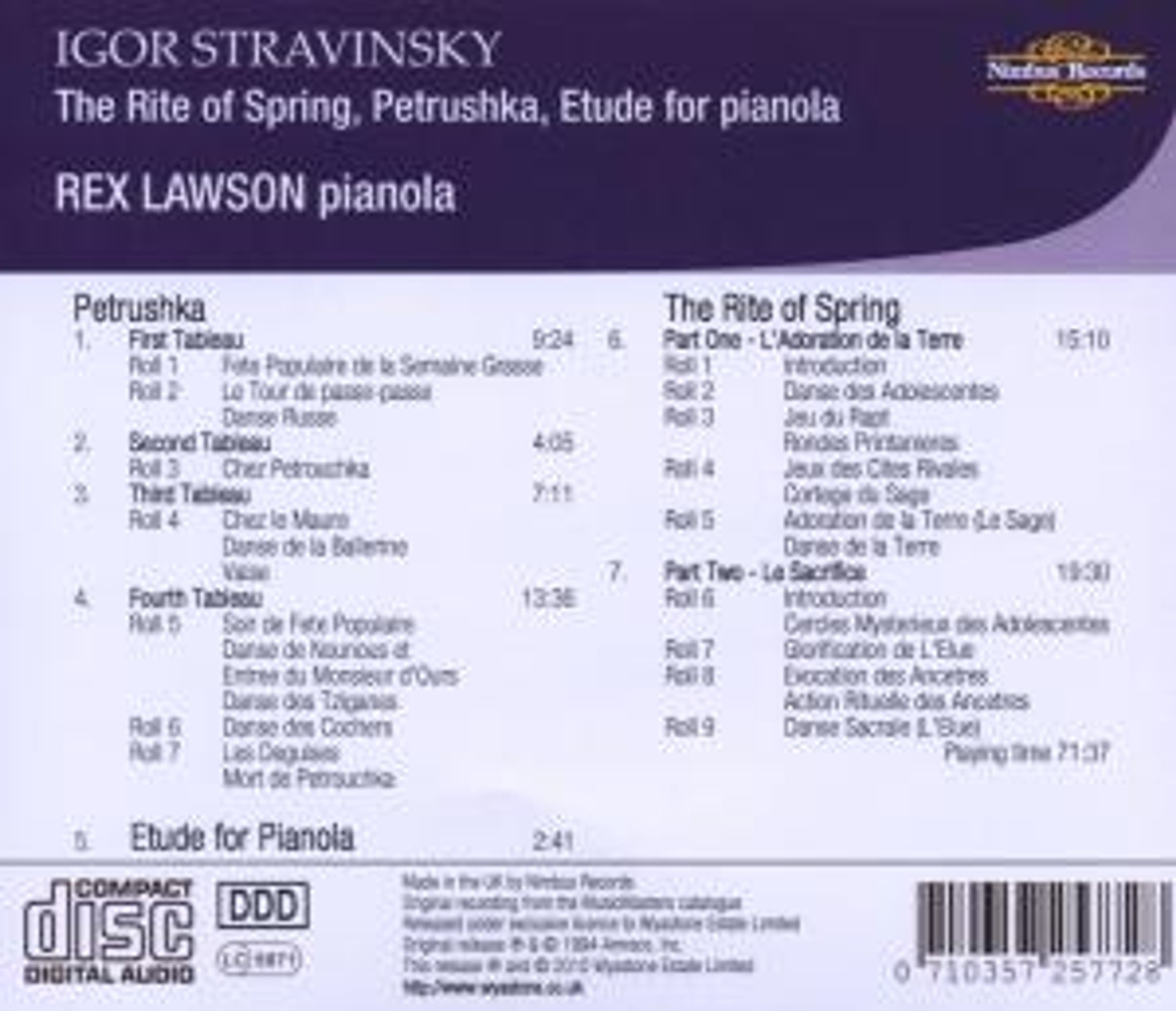 Auf den ersten Blick erscheint es seltsam, dass sich ein weltgewandter, erfolgreicher Komponist wie Strawinsky stundenlang in einem kleinen Studio einschließt und seine eigene Musik für ein Prachtstück namens Pianola arrangiert. Jeder weiß doch, dass Pianolas (ein nicht ganz so allgemeiner Begriff für selbstspielende Klaviere) wie alte, ramponierte Honky-Tonk-Kneipen klingen und jede musikalische Inspiration im Quietschen ihrer Zahnräder und dem Keuchen ihrer Pedale ersticken!