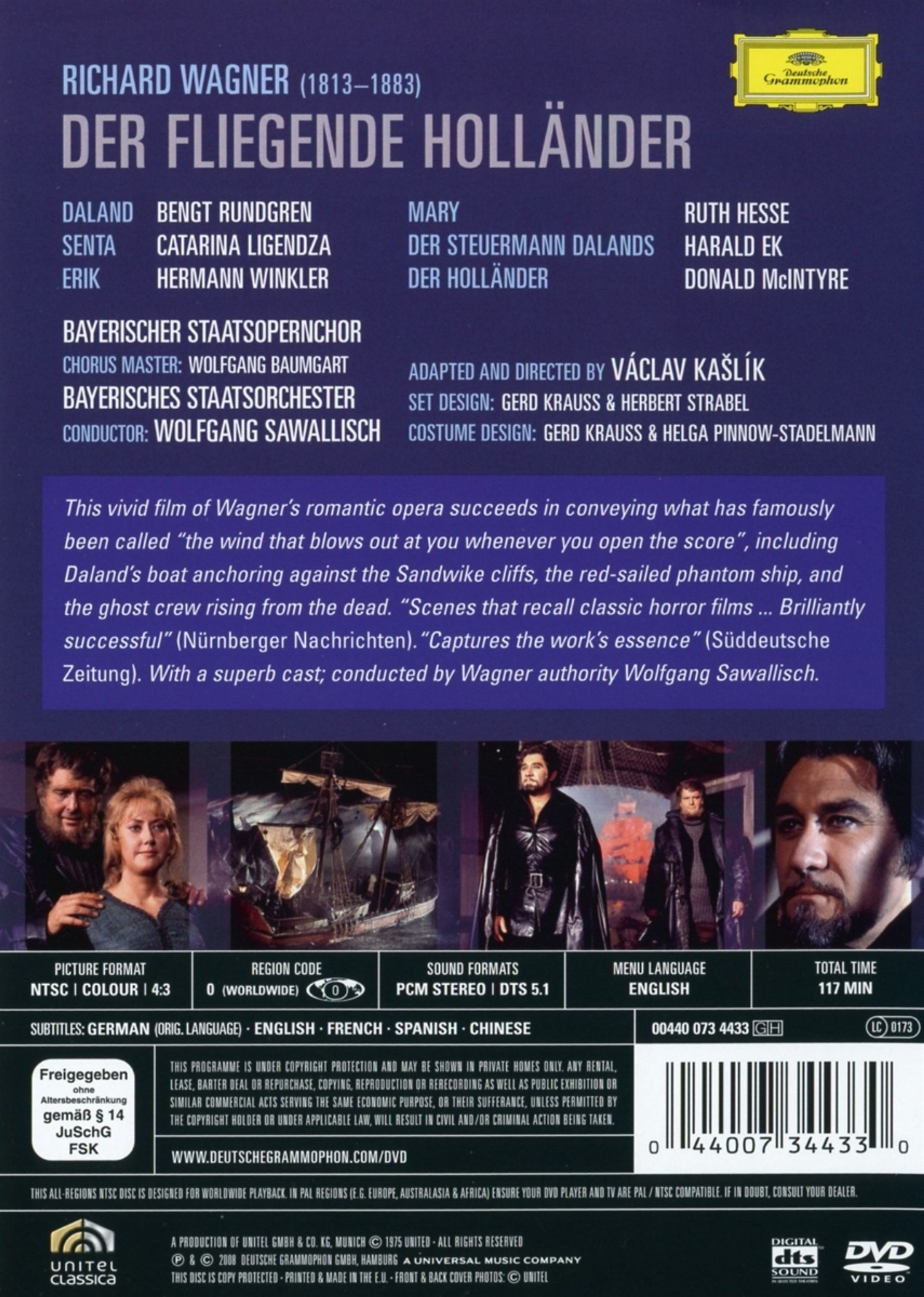 Noch nie zuvor wurde dieser legendäre Opernfilm kommerziell veröffentlicht: 1974 inszenierte der bekannte Regisseur Vaclav Kaslik Wagners romantische Oper auf revolutionäre und kontroverse Weise im Stil eines atmosphärischen Horrothrillers. Eine brillante Idee, mit der die phantastische Essenz des fliegenden Holländers kongenial eingefangen wurde. Der Zuschauer erlebt mit Donald McIntire und Catarina Ligendza erstklassige Sänger in den Hauptrollen, machtvoll begleitet vom Bayerischen Staatsorchester unter Maestro Wolfgang Sawallisch, und bekommt zusätzlich eine vollwertige, durchdachte Kinoinszenierung.