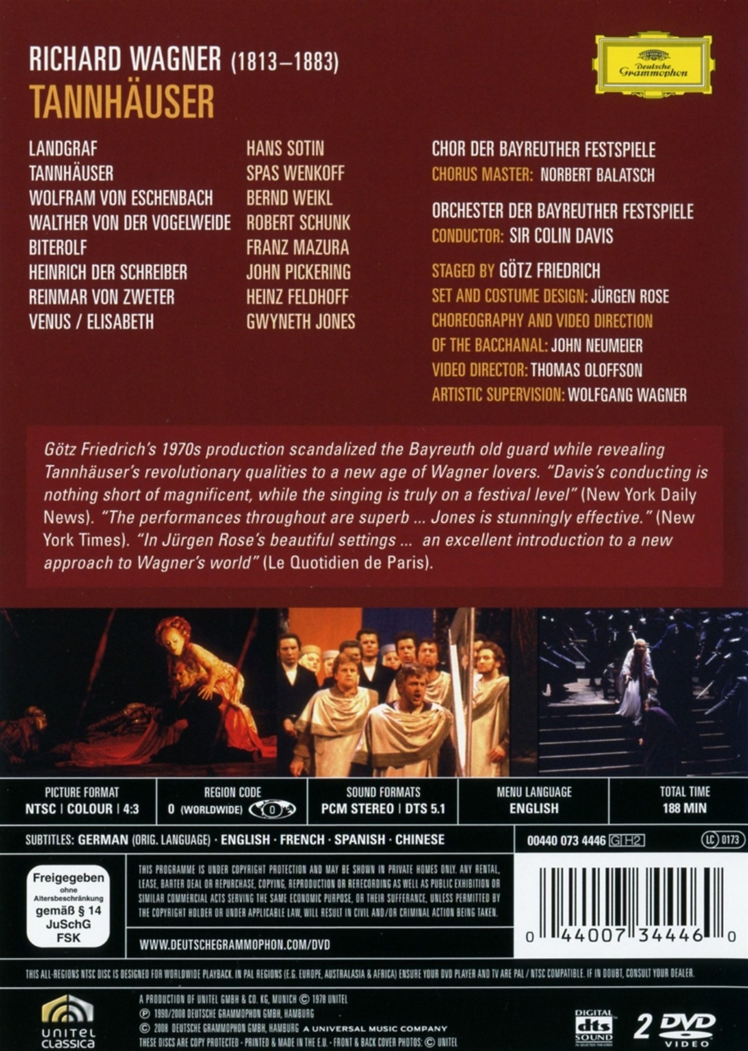 FonoForum 11/08: "Spas Wenkoff singt den Tannhäuser mit üppigem, baritonal gefärbtem Timbre - mit dieser Leistung einer der besten Heldentenöre der letzten Jahrzehnte. Die hingebungsvolle Gwyneth Jones in der Doppelrolle als Venus/Elisabeth, Hans Sotins wunderbar sonorer Landgraf, Bernd Weikls eleganter Wolfram, Robert Schunk, Franz Mazura als herausragende Vertreter der Minnesängerriege - ein Fest."Disk 1 von 2 (DVD)