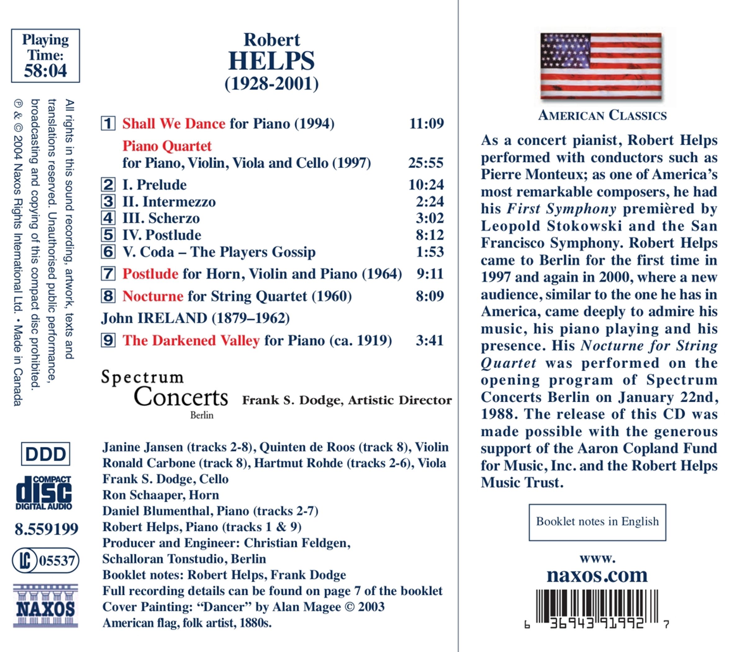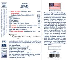 Der amerikanische Komponist und Pianist Robert Helps trat als Klaviersolist zusammen mit dem legendären Dirigenten Pierre Monteux auf. Helps erste Symphonie wurde von Leopold Stokowski und dem San Francisco Symphony Orchestra uraufgeführt. Diese CD enthält Kammermusik dieses spannenden Komponisten. Hilft sich selbst, als Klaviersolist mitzuwirken.