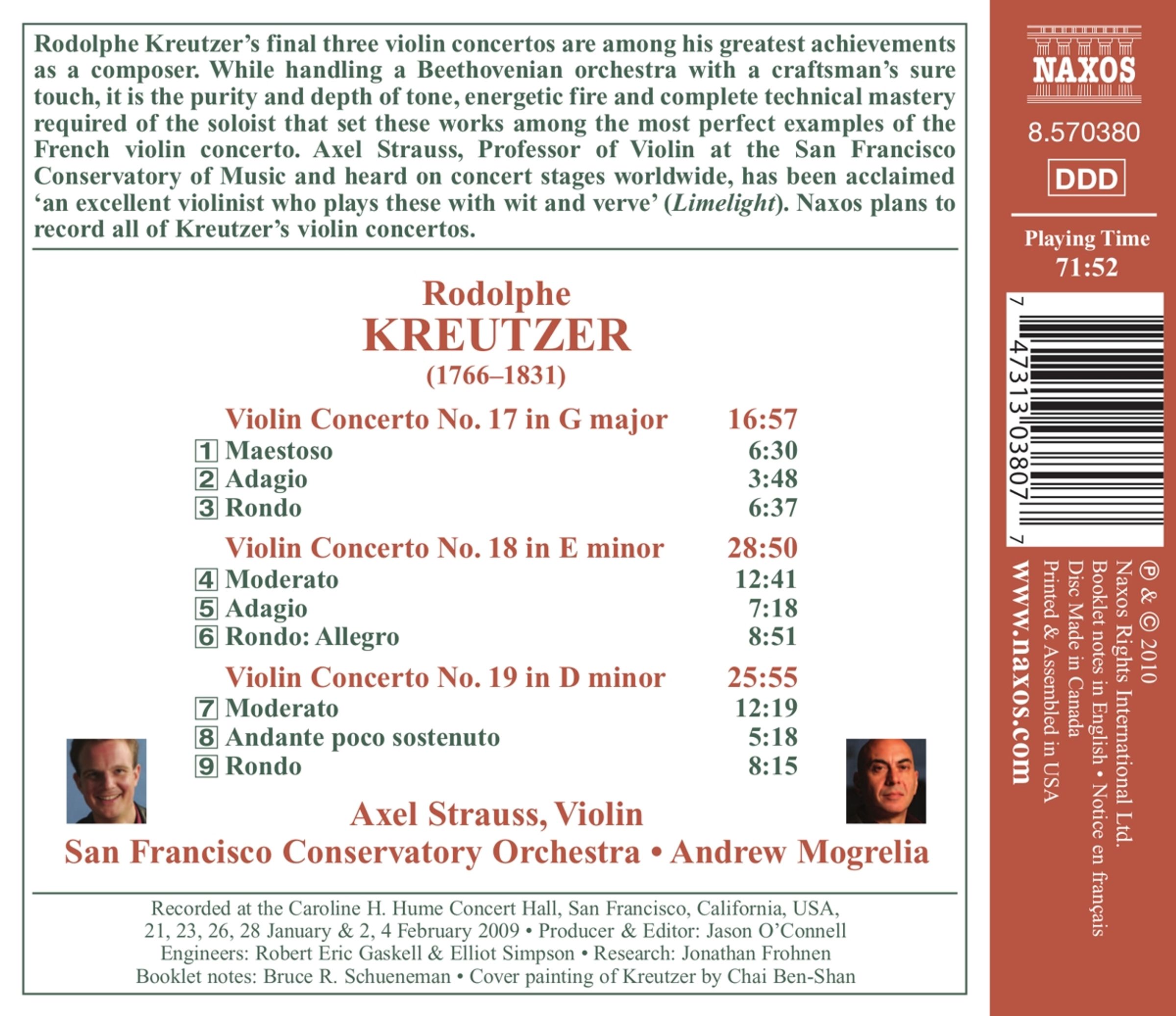 Die drei letzten Violinkonzerte des in Versailles geborenen Komponisten und Geigers Rudolph Kreutzer (dem Beethoven übrigens seine berühmte Sonate widmete) stellen einen Höhepunkt seines Werkes dar. Von beethovenschen Ausmaßen ist auch der Orchesterpart, den Kreutzer mit meisterlicher Fachkenntnis beherrscht, während dem Solisten eine Reinheit und Fülle des Tons, eine edle Phrasierung, Feuereifer und technische Höchstleistung abverlangt werden, die diese Konzerte zu perfekten Beispielen für das Französische Violinkonzert machen.
